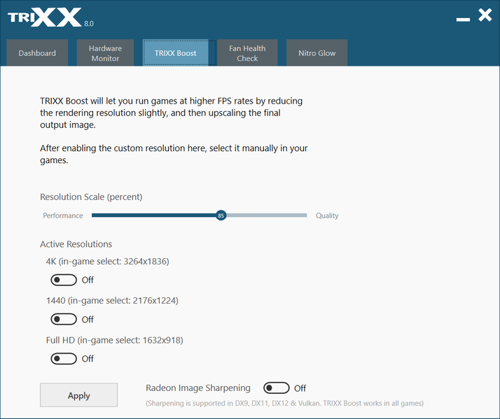Самая интересная вкладка — Trixx Boost. С ее помощью можно включить рендеринг (растеризацию) 3D-графики в более низком разрешении, чем текущее выставленное в игре, так что ускоритель выдаст более высокую скорость, а по окончании происходит апскейлинг (растягивание) полученной картинки до текущего разрешения. В прошлых обзорах карт Sapphire мы уже писали об этом новшестве.