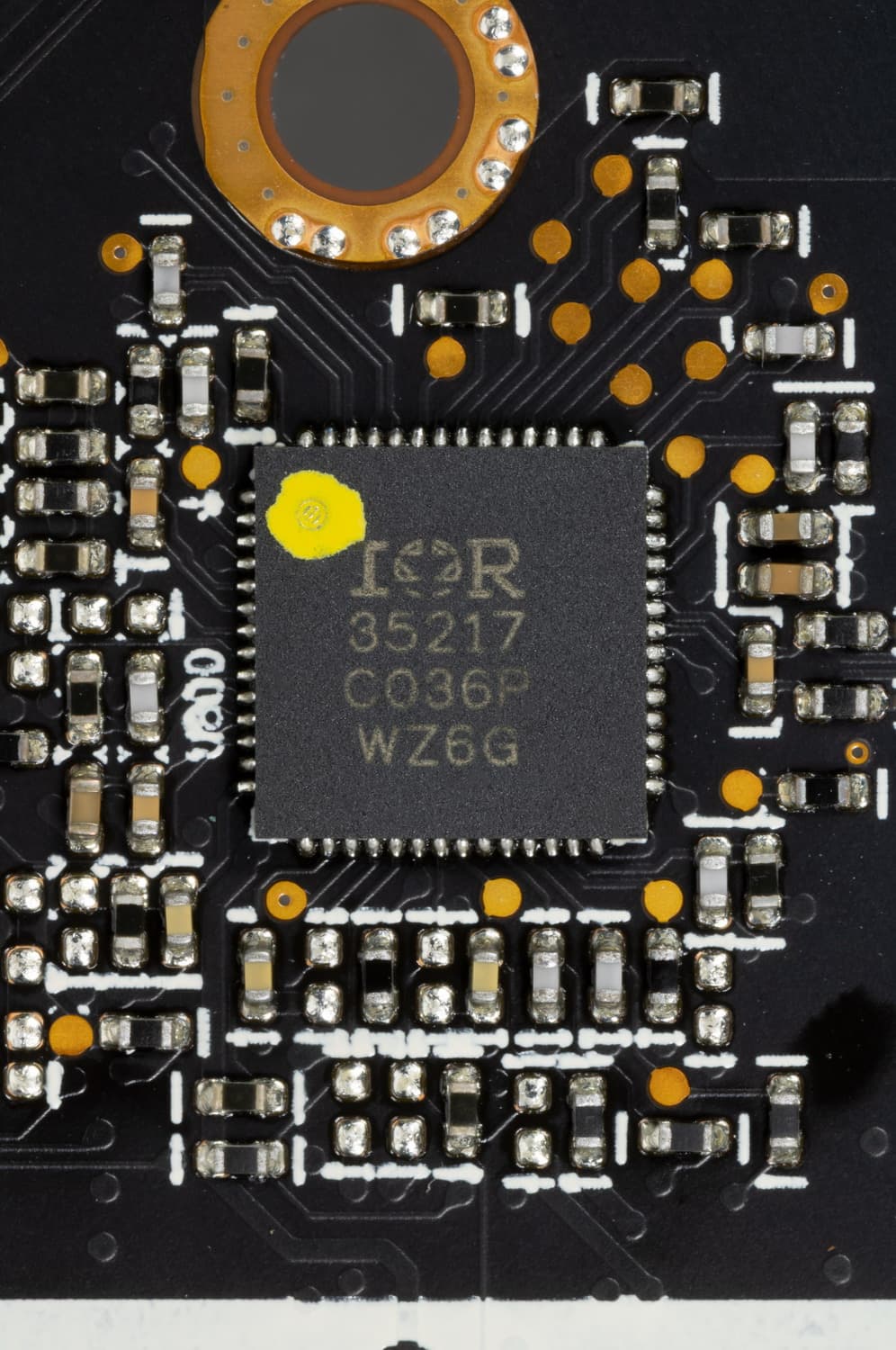 Также на оборотной стороны платы расположен и ШИМ-контроллер IR35217 (International Rectifier, которая сейчас также входит в состав Infineon). Он управляет тремя фазами питания микросхем памяти.