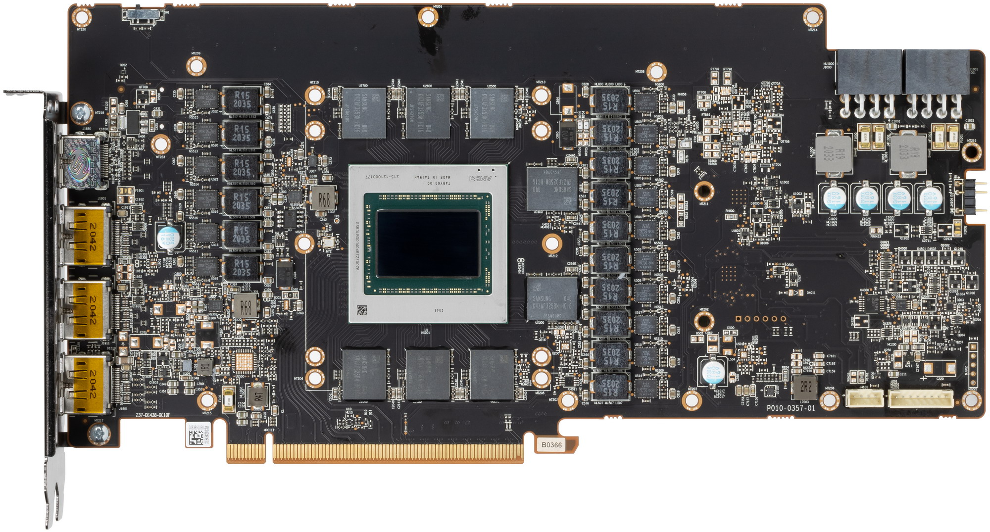 Суммарное количество фаз питания у референс-карты Radeon RX 6800 XT — 15, а у карты Sapphire — 16. При этом разводка платы у Sapphire мало чем отличается от референса, просто у последнего одна фаза не распаяна, а инженеры Sapphire использовали весь потенциал PCB.