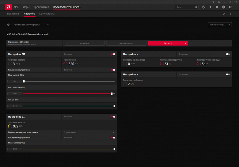 Ручной разгон был опробован с помощью стандартной утилиты AMD, входящей в состав панели управления драйверами.