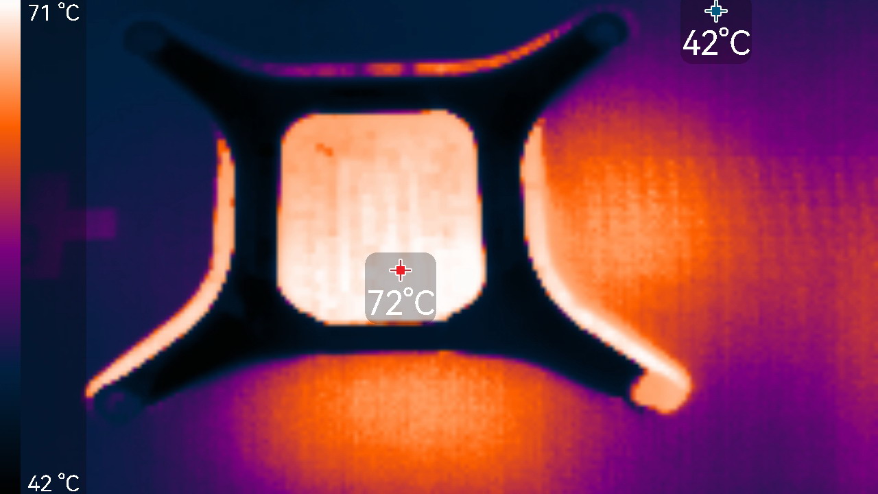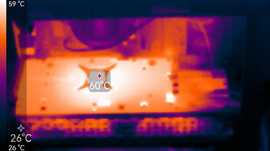 После прогона под нагрузкой максимальная температура ядра не превысила 57 градусов (hot spot — 88 °C; допускается нагрев до 110 градусов), а микросхем памяти — 90 °C, что является хорошим результатом. Энергопотребление карты доходило до 331 Вт.
