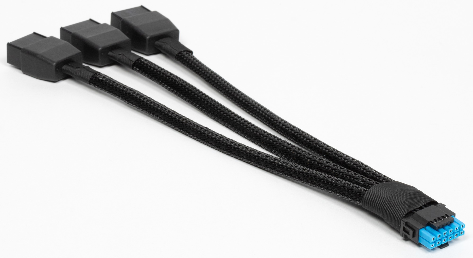 Для владельцев старых БП версии ниже ATX 3.0, не имеющих кабеля 12VHPWR, в комплекте поставки имеется адаптер-переходник на три хорошо известных 8-контактных разъема питания (его также можно спрятать за пластиной на карте).
