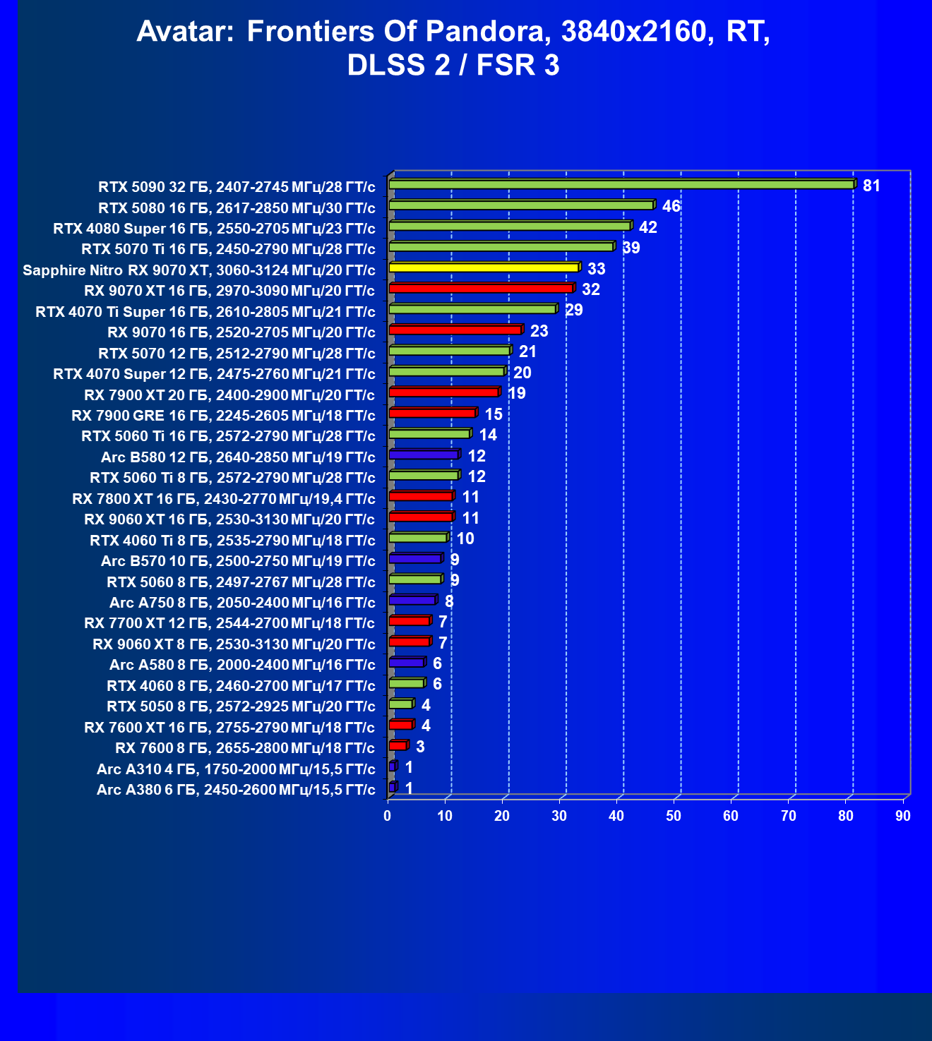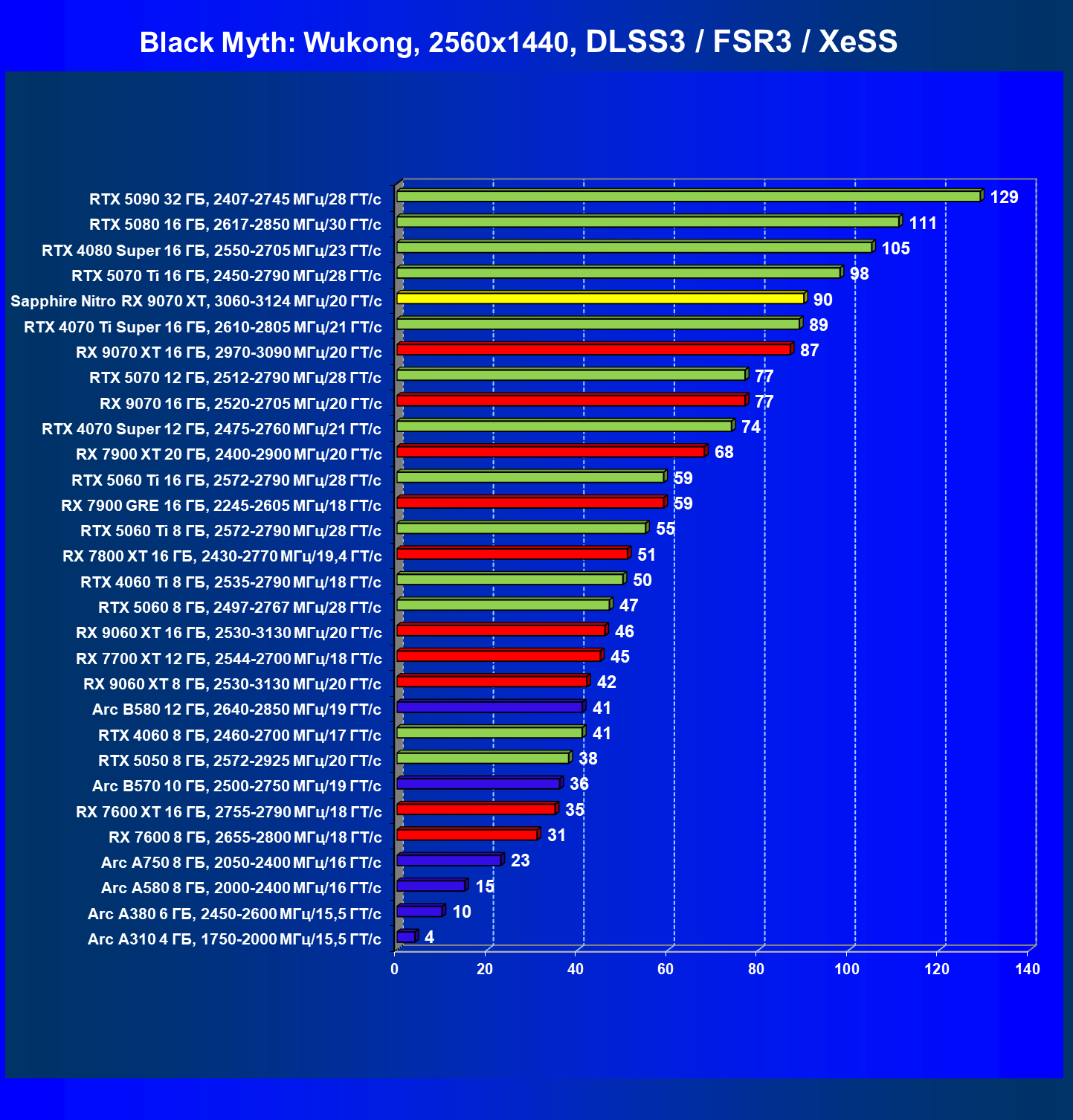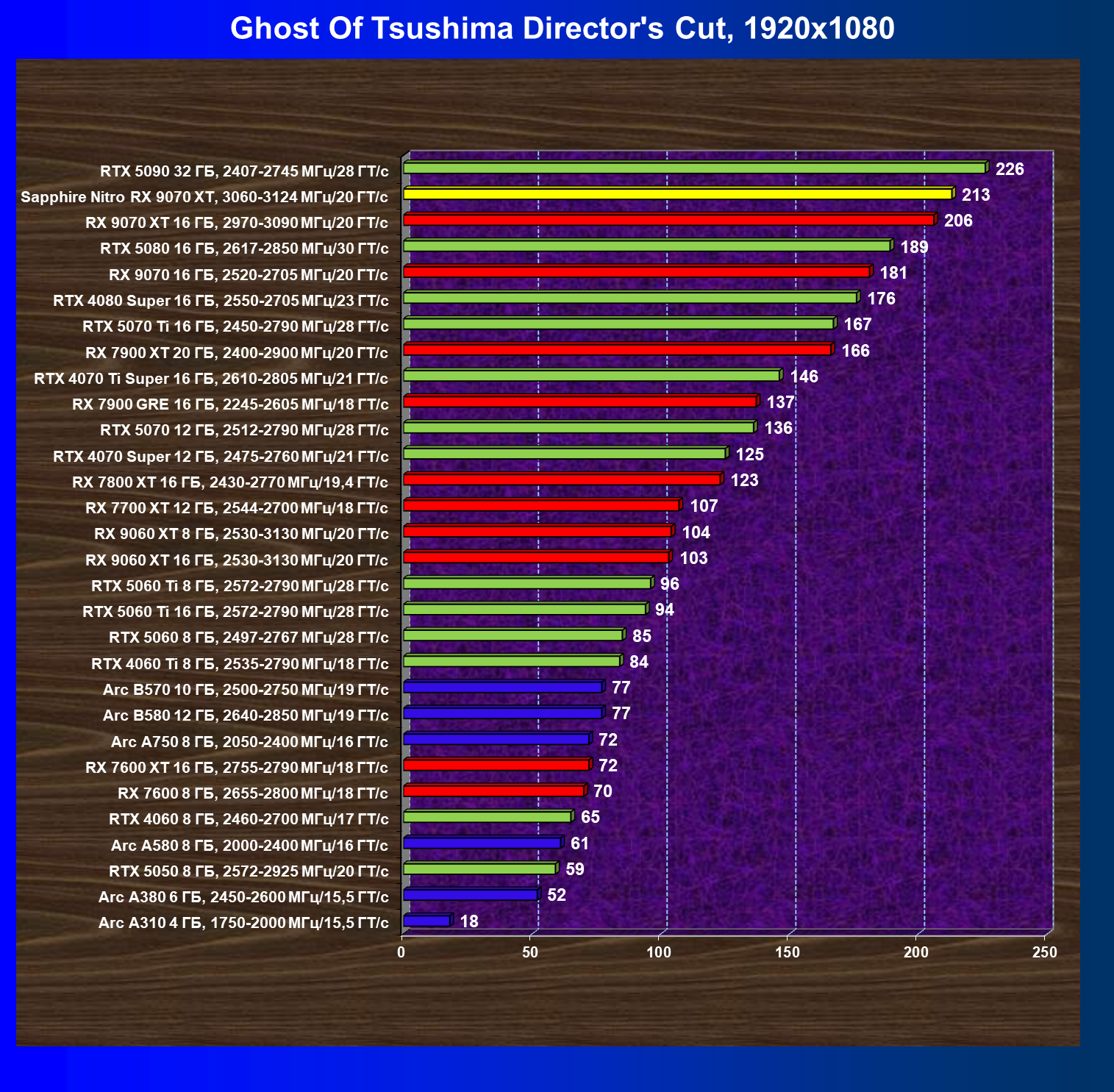 Да, RTX 5070 Ti — лидер, но при этом большого отрыва семейства GeForce от Radeon RX 9000 мы не видим. Так что, с учетом перспективности внедрения MFG в рамках FSR4 можно сказать, что Radeon RX 9070 XT уже выступает почти на уровне RTX 5070 Ti.