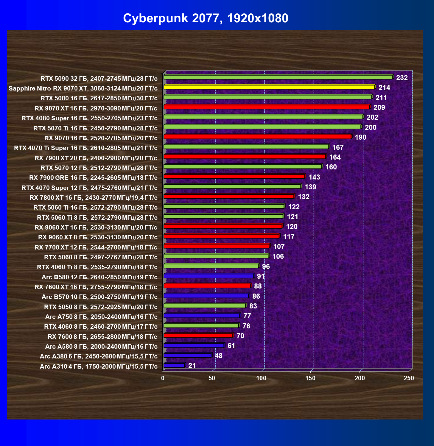 В данном случае как референс-карта Radeon RX 9070 XT, так и карта Sapphire оказались в лидерах, правда GeForce RTX 5070 Ti идет буквально следом. Про карты предыдущих поколений мы уже тут не упоминаем (их цены давно уже вне здравого смысла, либо какие-то продукты вовсе пропали уже).