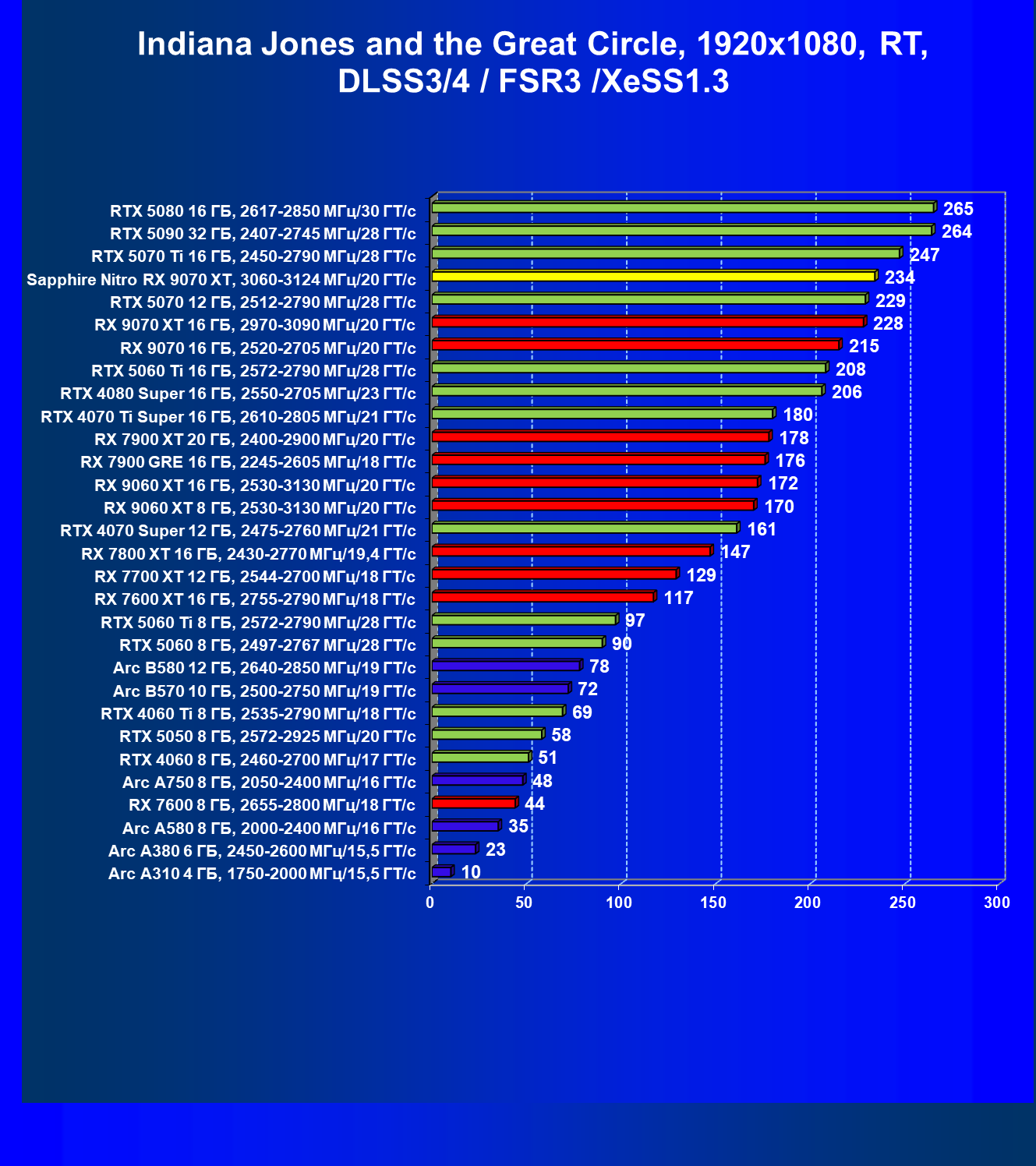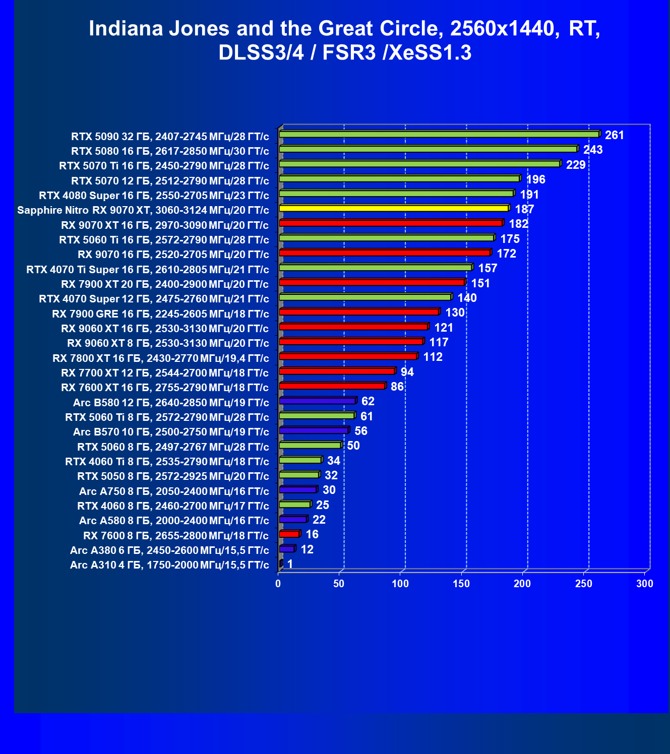 В играх с активной трассировкой лучей и технологиями масштабирования FSR/XeSS Radeon RX 9070 XT находится на одном уровне с GeForce RTX 4070 Ti Super и, опять же, весьма существенно опережает флагманов предыдущего поколения Radeon RX 7000. В разрешениях до 2.5K включительно можно получить хороший комфорт в играх на высоких настройках графики и без FSR/XeSS (только с RT), а во многих играх приемлемая производительность будет и в 4K, однако в таком разрешении в ряде игр использование трассировки лучей уже потребуется сочетать с технологиями динамического масштабирования.