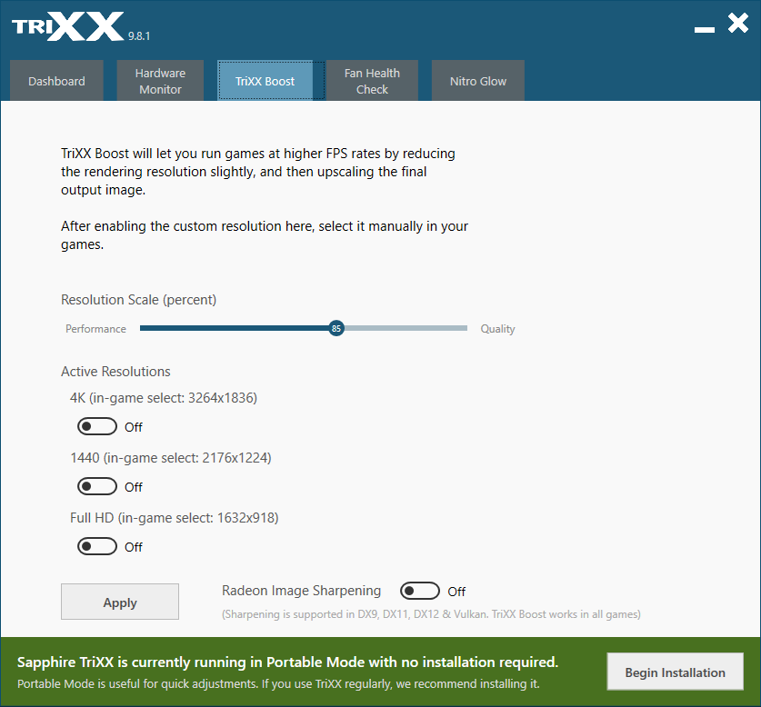 Управление работой карты обеспечивается с помощью фирменной программы Sapphire Trixx. Должен отметить, что по сути утилита дает управлять лишь технологией динамического масштабирования, подсветкой и проверять вентиляторы. Управлять частотами работы и вольтажами — не получится, для этого придется использовать настройки AMD в драйверах.