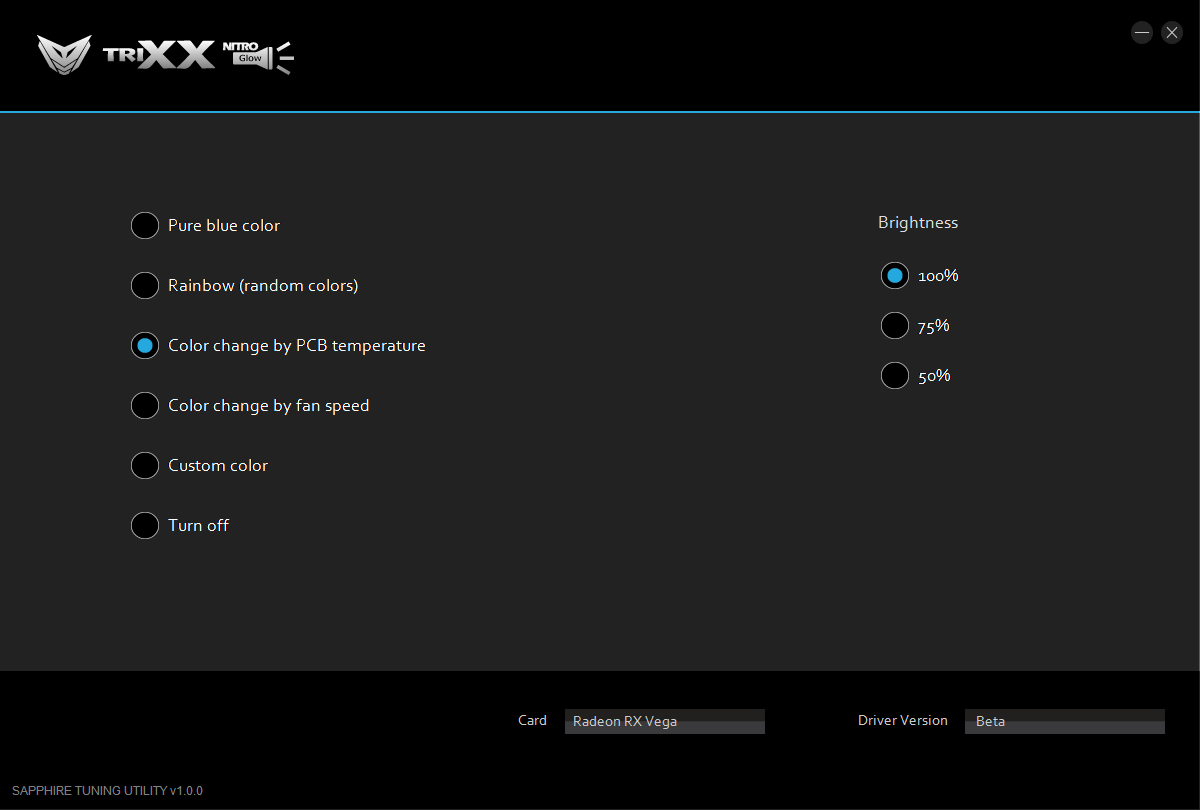 Помимо стандартных настроек AMD (которые в современных драйверах компании предоставляют оверклокерам широкие возможности) ускорителем можно управлять с помощью фирменной утилиты Sapphire Trixx 3.0. Программа позволяет автоматически настроить работу ускорителя на максимально возможные частоты (если владелец не желает самостоятельно искать достижимый максимум). Эта же утилита управляет вентиляторами, и ее составной частью является контроль подсветки системы охлаждения: можно настроить как цветовую гамму, так и реакцию подсветки на события (нагрев карты, воспроизведение музыки и т. д.).