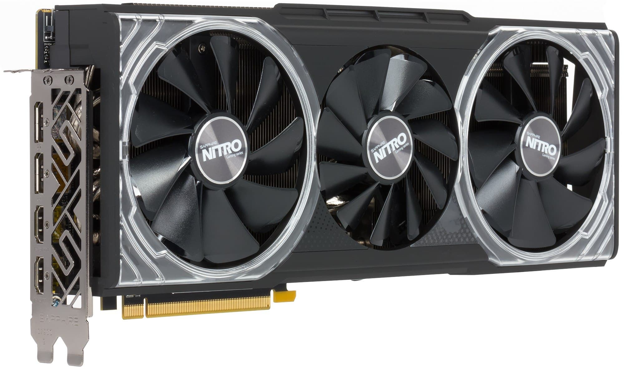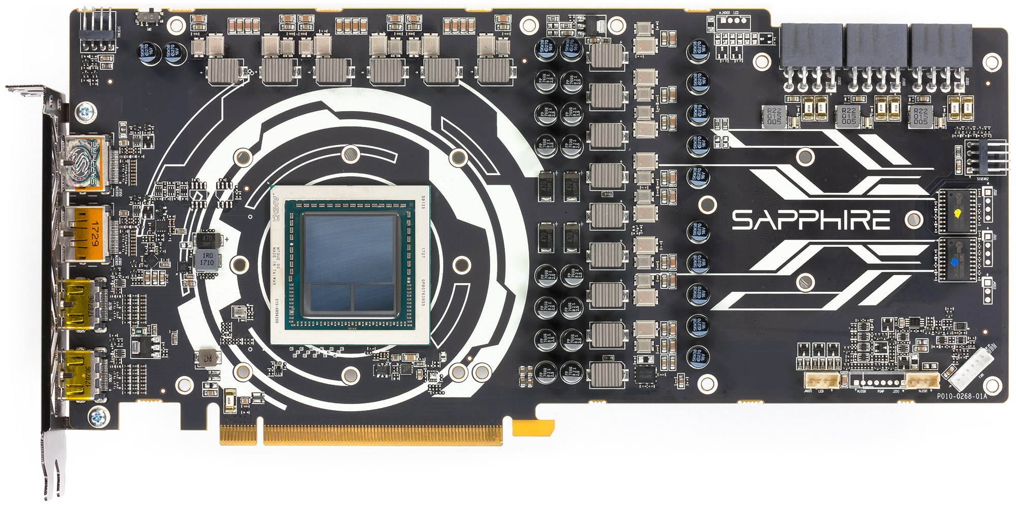 Инженеры компании Sapphire переработали PCB, усовершенствовав в основном блок питания: карта имеет увеличенное до трех количество разъемов питания, что гарантирует стабильную работу при повышении предела мощности (как известно, этот параметр можно менять в настройках драйверов AMD в разделе Wattman). Также мы видим, что фабрично частоты карты не повышены, равны стандартным значениям, поэтому все зависит от желания оверклокера: повышать ли частоту и насколько.