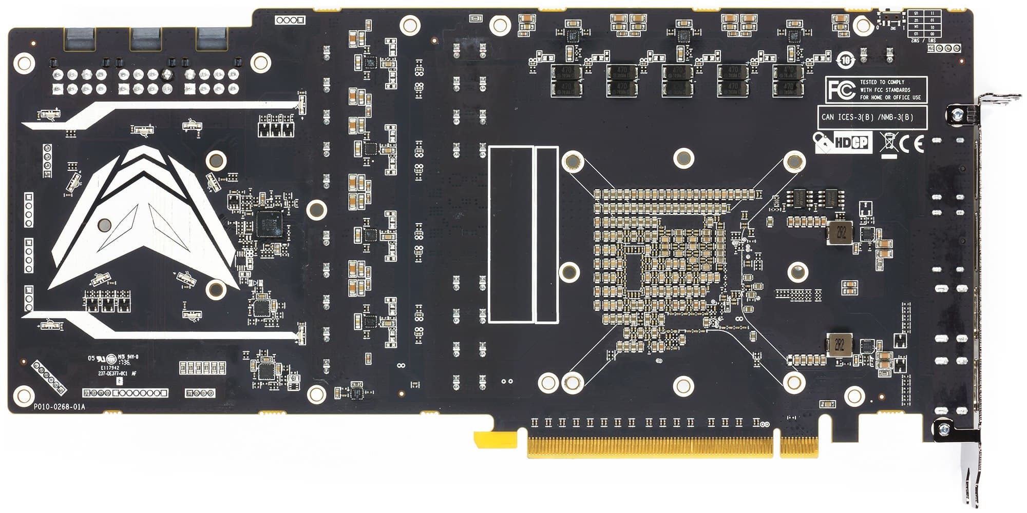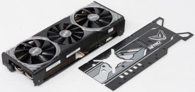 Главной частью кулера являются два пластинчатых никелированных радиатора, соединенные между собой тепловыми трубками, которые впрессованы в основание главного радиатора и обеспечивают равномерное распределение тепла по ребрам. На подошве основного радиатора установлена испарительная камера, соприкасающаяся с GPU. Мы уже рассказывали о принципе работы таких камер: внутри легкоиспаряемая жидкость, переносящая тепло с горячей стороны камеры на холодную. Поверх радиаторов установлен кожух с тремя вентиляторами, работающими на одинаковой частоте вращения (по утверждению производителя, каждый вентилятор снабжен двойным подшипником). Инженеры также обеспечили более точное управление частотой вращения вентиляторов, сведя шум к минимуму. Вентиляторы поддерживают систему Quick Connect. Это значит, что их можно с легкостью снять, очистить и заменить, поскольку они надежно фиксируются всего одним винтом, и разбирать кожух или иные элементы видеокарты не потребуется. Микросхемы памяти находятся в одной упаковке с ядром, поэтому также охлаждаются испарительной камерой. К силовым транзисторам через термоинтерфейс прижаты выступы того же основного радиатора. С оборотной стороны карта прикрывается специальной пластиной, которая не только обеспечивает жесткость печатной платы, но и имеет эффектную подсветку в виде логотипа серии. Следует также отметить, что кулер имеет особенность останавливать вентиляторы при небольшом нагреве GPU (до 50-52 градусов), поэтому не стоит переживать, если при включении компьютера вентиляторы на кулере не вращаются. Они могут не запускаться и при длительной работе в режиме 2D.