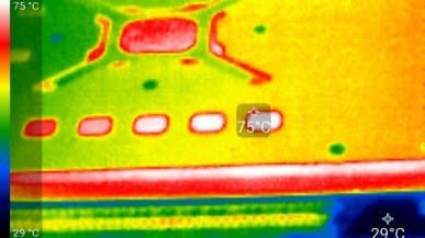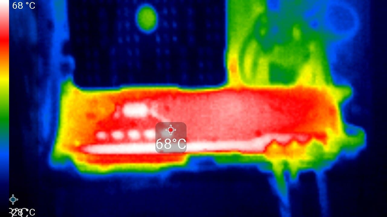 Максимальный нагрев — с обратной стороны печатной платы над силовыми транзисторами.