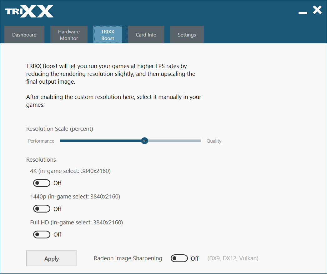 И вот, наверное, самая интересная вкладка: Trixx Boost. С ее помощью можно включить рендеринг (растеризацию) 3D-графики в более низком разрешении, чем текущее выставленное в игре, так что ускоритель выдаст более высокую скорость, а по окончании происходит апскейлинг (растягивание) полученной картинки до текущего разрешения.