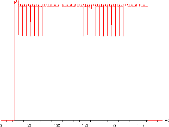 На любом уровне яркости видимое мерцание отсутствует, его не выявляет и тест на стробоскопический эффект. Регистрация зависимости яркости от времени при различных уровнях яркости выявила модуляцию яркости с очень высоким коэффициентом заполнения, что и объясняет отсутствие мерцания. В доказательство приведем графики зависимости яркости (вертикальная ось) от времени (горизонтальная ось) при различных значениях настройки Яркость в случае белого поля на 10% от площади экрана.