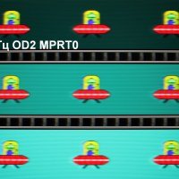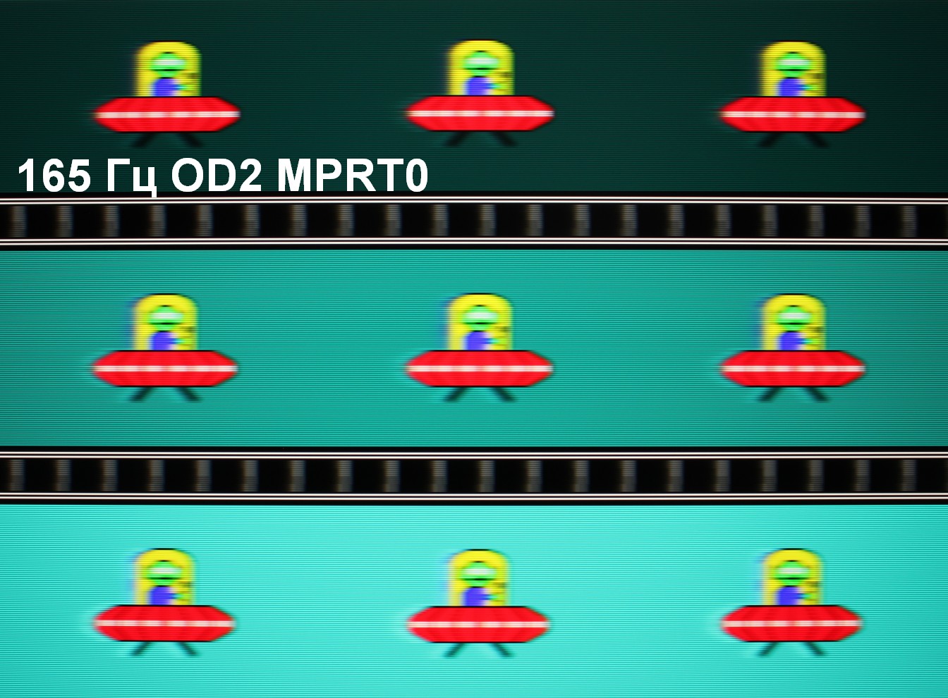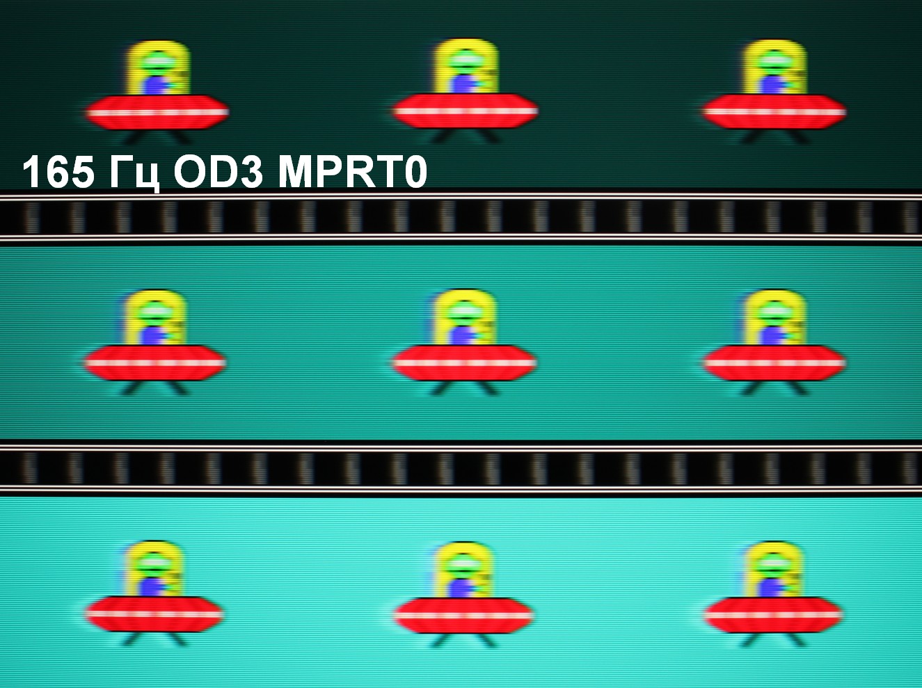 Для наглядного представления о том, что на практике означает такая скорость матрицы, и какие могут быть артефакты от разгона, приведем серию снимков, полученных с помощью движущейся камеры. Такие снимки показывают, что видит человек, если он следит глазами за двигающимся на экране объектом. Описание теста приведено тут, страница с самим тестом тут. Использовались рекомендованные установки (скорость движения 960 пиксель/с для частот обновления 60 и 120 Гц или 990 пиксель/с для 165 Гц, то есть на целое число пикселей за кадр), выдержка 1/15 с. На фотографиях указаны значения частоты обновления, а также включен ли разгон (ODx; x = 0 — 3) и режим вставки темного кадра (MPRTx; x = 0 — выключен, x = 1 — включен).