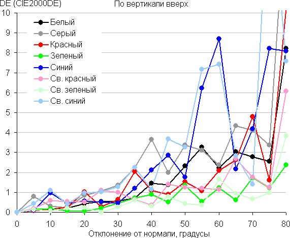 Для количественной характеристики изменения цветопередачи мы провели колориметрические измерения для белого, серого (127, 127, 127), красного, зеленого и синего, а также светло-красного, светло-зеленого и светло-синего полей во весь экран с использованием установки, подобной той, что применялась в предыдущем тесте. Измерения проводились в диапазоне углов от 0° (датчик направлен перпендикулярно к экрану) до 80° с шагом в 5°. Полученные значения интенсивностей были пересчитаны в ΔE относительно замера каждого поля при перпендикулярном положении датчика относительно экрана. Результаты представлены ниже: