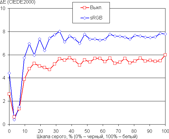 Цветовой баланс просто при выборе одного из трех профилей Польз. 1-3 (и без коррекции) для настройки Цвет, которые по умолчанию обеспечивают максимальную яркость и контрастность с сохранением приемлемого качества изображения, приемлемый, так как цветовая температура очень близка к стандартным 6500 К и отклонение от спектра абсолютно черного тела (параметр ΔE) ниже 10 единиц, что для потребительского устройства считается хорошим показателем. При выборе профиля sRGB цветовой баланс чуть хуже, но все равно остается приемлемым для непрофессиональной работы с цветом. Графики ниже показывают цветовую температуру на различных участках шкалы серого и ΔE: