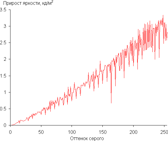 Реальная гамма-кривая ближе всего к стандартной при выборе варианта Гамма 2.2, поэтому далее мы измерили яркость 256 оттенков серого (от 0, 0, 0 до 255, 255, 255) при этом значении. График ниже показывает прирост (не абсолютное значение!) яркости между соседними полутонами: