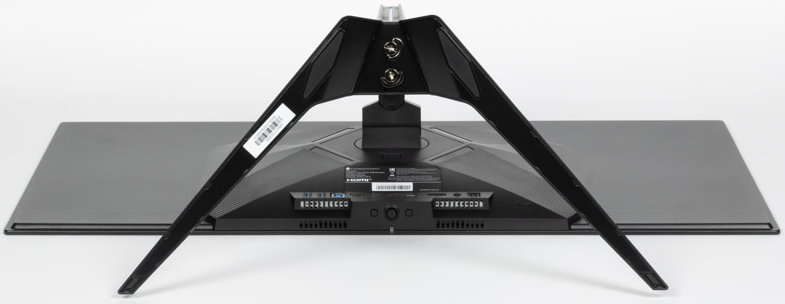 Разъем питания и интерфейсные разъемы размещены в нижней части кожуха сзади и ориентированы назад. Подключать кабели к этим разъемам удобно. Также на задней панели есть разъем для кенсингтонского замка. Отходящие кабели можно пропустить через подъем в центре основания подставки: так сзади монитор выглядит аккуратнее.