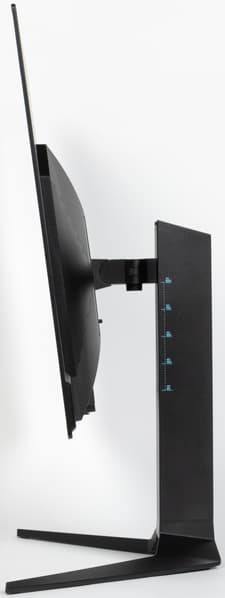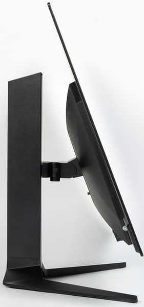Стойка имеет фиксированную высоту, но подпираемый пружиной механизм со стальным рельсовым шариковым подшипником обеспечивает вертикальное перемещение шарнира, на который крепится блок экрана. В итоге легким движением руки экран можно установить на нужную высоту. Подставка позволяет наклонять блок экрана вперед от вертикального положения и больше наклонять назад, поворачивать вправо-влево, а также переворачивать в портретную ориентацию по и против часовой стрелки. В последнем случае, однако, высоты подъема блока экрана не хватает, чтобы при портретной ориентации экран занял вертикальное положение.