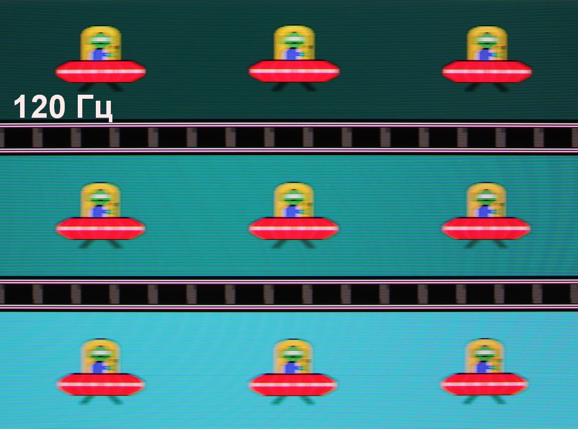 Попробуем представить, что было бы в случае матрицы с мгновенным переключением пикселей. Для нее при 60 Гц объект со скоростью движения 960 пиксель/с размывается на 16 пикселей, при 120 Гц — на 8 пикселей (скорость 960 пиксель/с), при 165 Гц — на 6 пикселей (скорость 990 пиксель/с). Размывается, так как фокус зрения движется с указанной скоростью, а объект неподвижно выводится на 1/60, 1/120 или на 1/165 секунды. Для иллюстрации этого сымитируем размытие на перечисленное количество пикселей: