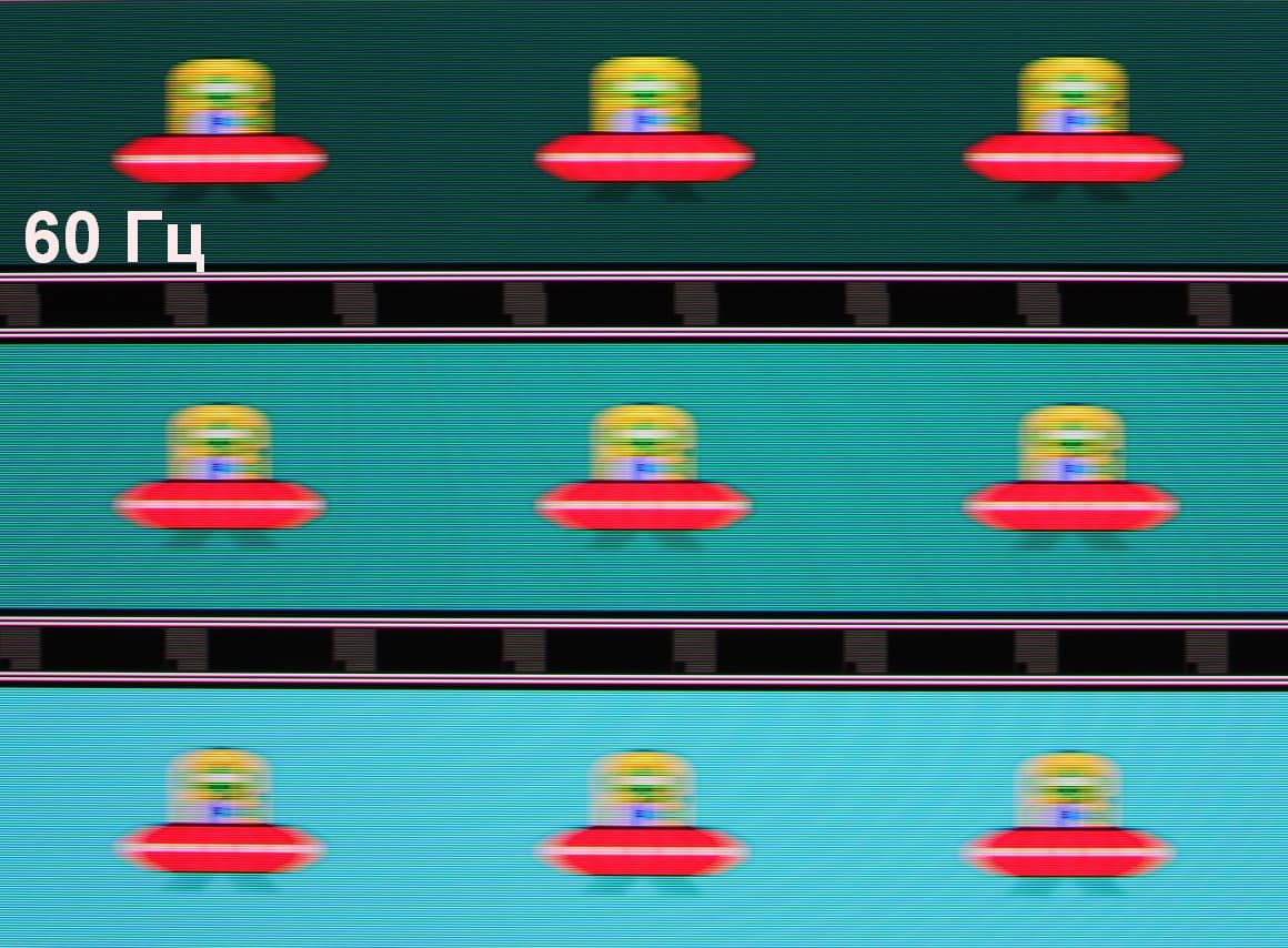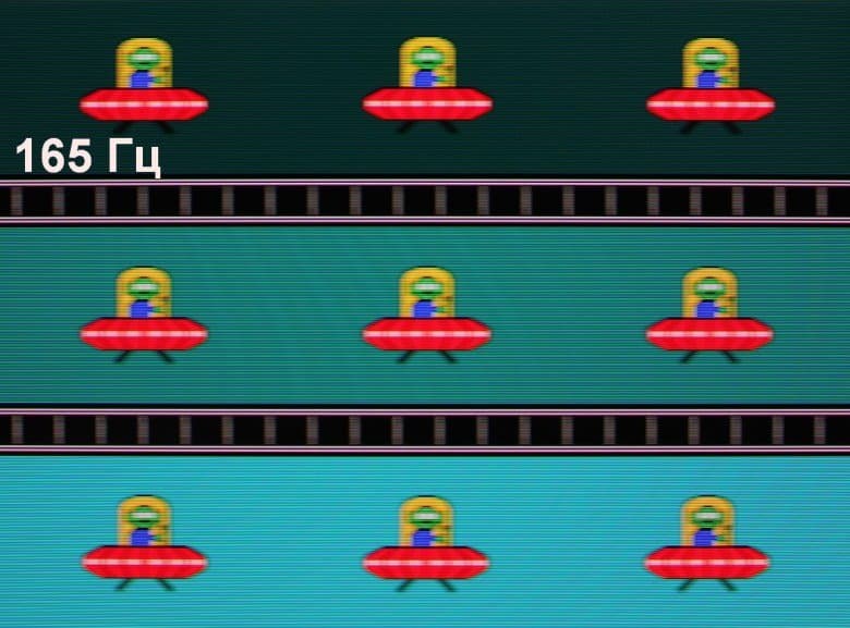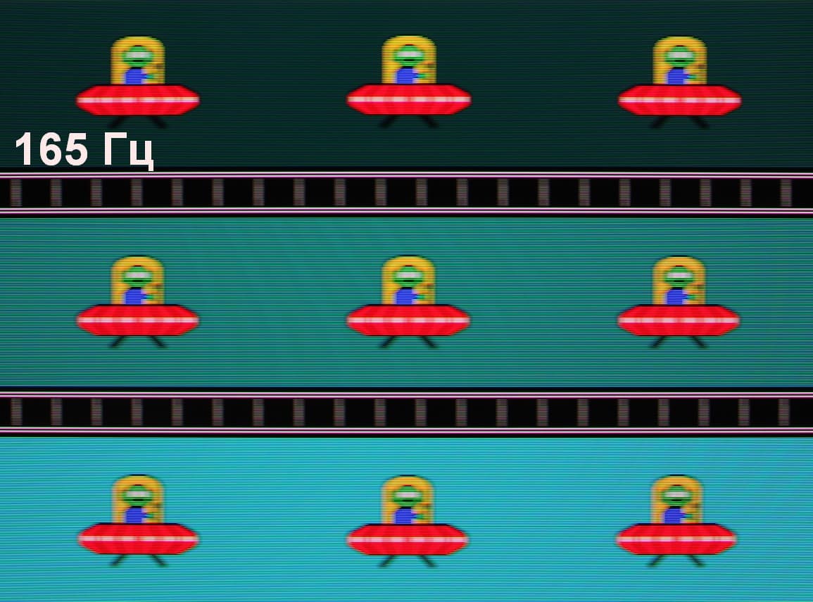 Для наглядного представления о том, что на практике означает такая скорость матрицы, и какие могут быть артефакты от разгона, приведем серию снимков, полученных с помощью движущейся камеры. Такие снимки показывают, что видит человек, если он следит глазами за двигающимся на экране объектом. Описание теста приведено тут, страница с самим тестом тут. Использовались рекомендованные установки (скорость движения 960 пиксель/с для частот обновления 60 и 120 Гц или 990 пиксель/с для 165 Гц, то есть на целое число пикселей за кадр), выдержка 1/15 с. На фотографиях указаны значения частоты обновления: