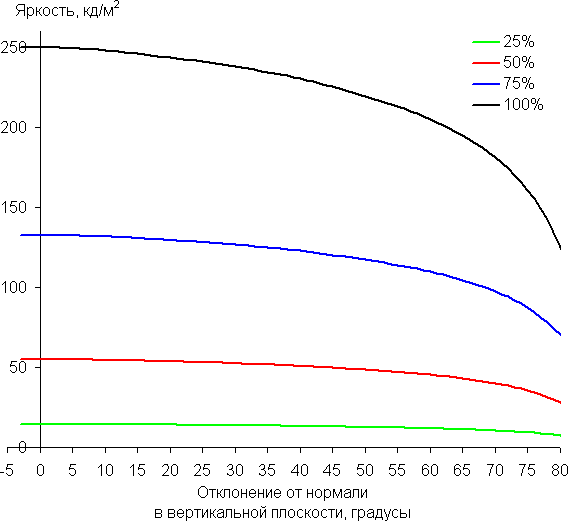 Снижение яркости на 50% от максимального значения достигается только при более чем 80 градусах отклонения. Для сравнения: в случае типичного ЖК-монитора на матрице VA яркость падает вдвое уже примерно при 35°.