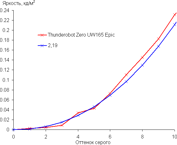 Рост скорости изменения яркости более-менее равномерный, и каждый следующий оттенок значимо ярче предыдущего, даже в самой темной области, что для игрового монитора очень хорошо: