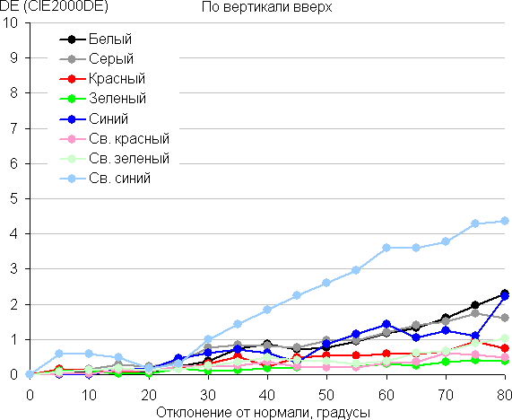 Для количественной характеристики изменения цветопередачи мы провели колориметрические измерения для белого, серого (127, 127, 127), красного, зеленого и синего, а также светло-красного, светло-зеленого и светло-синего полей во весь экран с использованием установки, подобной той, что применялась в предыдущем тесте. Измерения проводились в диапазоне углов от 0° (датчик направлен перпендикулярно к экрану) до 80° с шагом в 5°. Полученные значения интенсивностей были пересчитаны в отклонение ΔE относительно замера каждого поля при перпендикулярном положении датчика относительно экрана. Результаты представлены ниже: