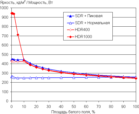 С изменением площади белого максимальная яркость также может меняться, при этом характер зависимости яркости от площади белого участка зависит как минимум от текущего режима — SDR или HDR и от значений настроек Режим яркости (Нормальная или Пиковая) и HDR (HDR1000 или HDR400) для первого и второго случая, соответственно: