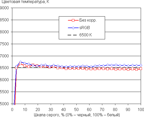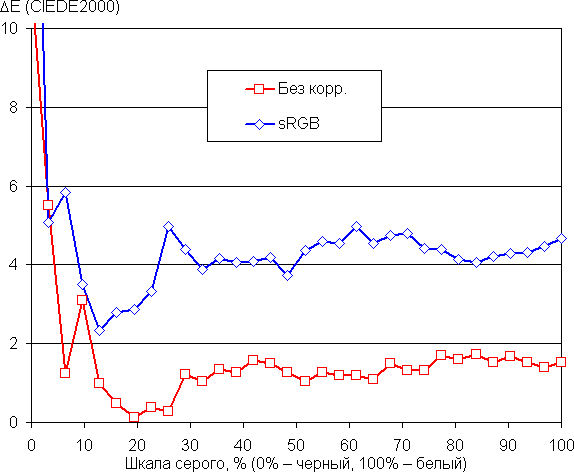 Графики ниже показывают цветовую температуру на различных участках шкалы серого и отклонение от спектра абсолютно черного тела (параметр ΔE) в случае настроек по умолчанию (подписано — Без корр.) и при выборе профиля sRGB (sRGB) также без дополнительной коррекции (которая, впрочем, и так невозможна):
