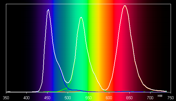 Ниже приведен спектр для белого поля (белая линия), наложенный на спектры красного, зеленого и синего полей (линии соответствующих цветов) в случае исходного цветового охвата: