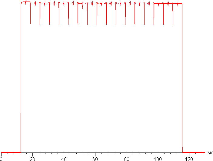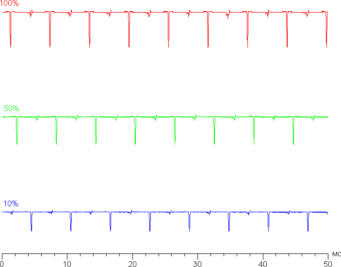 На любом уровне яркости видимое мерцание отсутствует, его не выявляет и тест на стробоскопический эффект. Регистрация зависимости яркости от времени при различных уровнях яркости выявила модуляцию яркости с очень высоким коэффициентом заполнения, что и объясняет отсутствие мерцания. В доказательство приведем графики зависимости яркости (вертикальная ось) от времени (горизонтальная ось) при различных значениях настройки Яркость в случае белого поля на 10% от площади экрана.