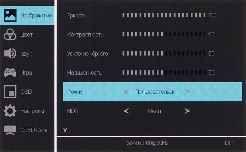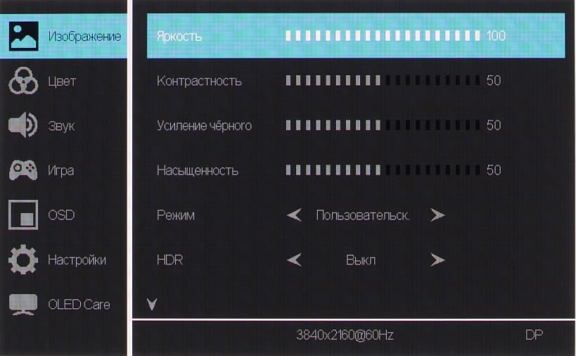 Диапазон регулировки яркости широкий. Например, в режиме SDR на белом поле площадью 10% от площади экрана (остальная площадь залита черным) при Яркость = 100 яркость составляет порядка 250 кд/м², а при Яркость = 0 она снижается до 17 кд/м². Это позволяет с комфортом играть, работать и смотреть фильмы как в освещенном, так и в темном помещении. Отметим, что даже сильное снижение яркости значимого влияния на качество изображения не оказывает.