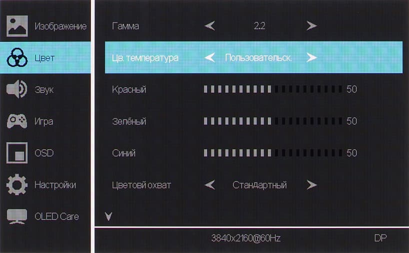 К сожалению, после выбора профиля sRGB или DCI-P3 с коррекцией цветового охвата часть настроек, в частности настройки цветового баланса, становятся недоступными. Это типичная ошибка многих производителей мониторов. Отметим, что на экранах с широким цветовым охватом без соответствующей коррекции цвета обычных изображений, оптимизированных для устройств sRGB, выглядят неестественно насыщенными. Впрочем, как правило, в развитых OS, в Windows в частности, и/или в более-менее продвинутом ПО для работы с изображениями нужная коррекция цвета достигается при использовании системы управления цветом. Например можно использовать цветовой профиль, созданный нами во время тестирования с помощью ПО DisplayCAL. Впрочем, в большинстве случаев достаточно будет выбрать профиль sRGB в мониторе.