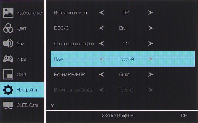Монитор оснащен тремя цифровыми входами в полноразмерном варианте — DisplayPort и парой HDMI, — дополненные входом USB-C. Выбор входа осуществляется в основном меню установок или в меню быстрого доступа. Есть неотключаемая функция автоматического поиска сигнала на входах.