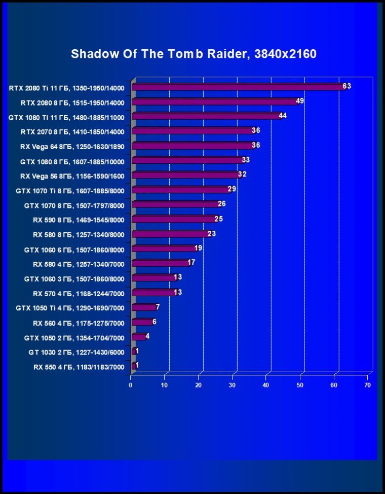 Итак, RTX 2070 соперничает с GTX 1070 Ti и даже GTX 1080, это как бы промежуточный вариант для разрешений между 2560×1440 и 1920×1080(1200): в части игр он обеспечит приличную играбельность в разрешении 2560×1440 с максимальными настройками графики, в других комфортно играть на максимальных настройках можно будет лишь в разрешении Full HD. Владельцам 4K-мониторов надо иметь в виду, что RTX 2070 обеспечит хорошую скорость в этом разрешении только на средних настройках качества графики.