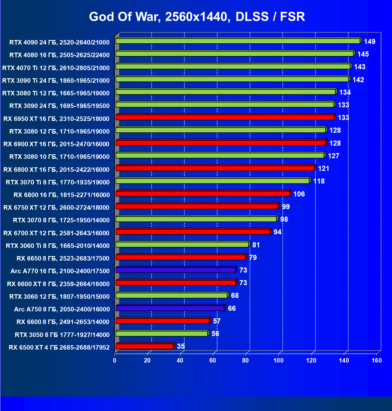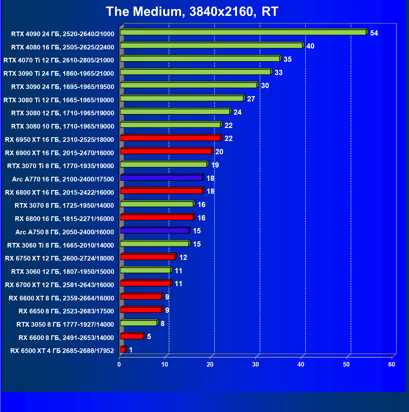 Все упомянутые видеокарты подойдут и для игр на мониторах с более массовым разрешением Full HD. При включении трассировки лучей совместно с DLSS, FSR или XeSS полный комфорт обеспечивают карты уровня Radeon RX 6600 XT и GeForce RTX 3060, GeForce RTX 3050, а также Intel Arc A770. А вот Radeon RX 6500 XT включение RT просто не потянет.