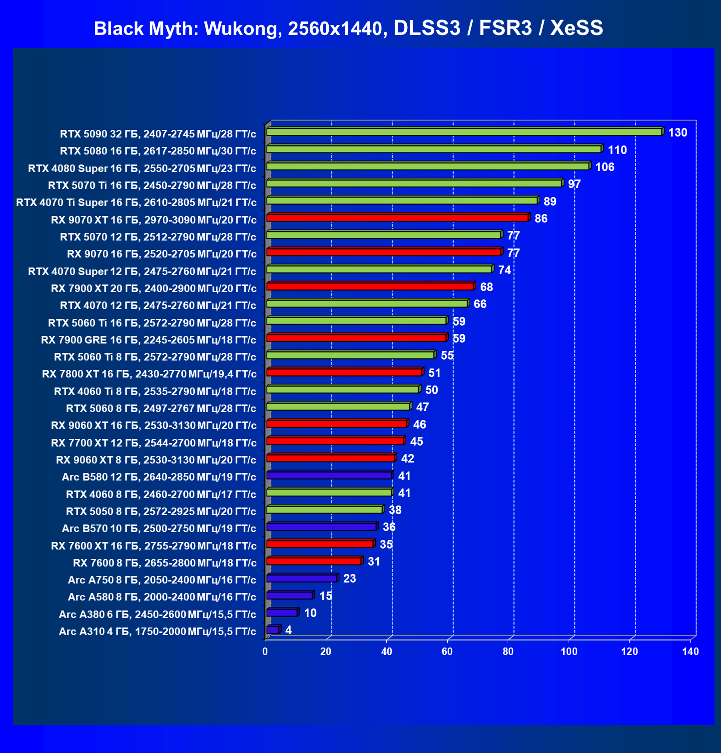 Разумеется, Arc B570 — это ускоритель для разрешения 1080p (Full HD), в котором можно получить хороший комфорт в играх при высоких настройках графики (но без использования трассировки лучей!). В ряде игр можно получить неплохую играбельность и в разрешении 1440p (2.5K).