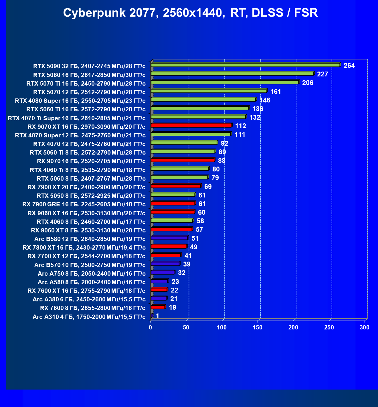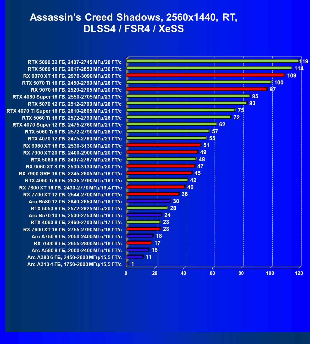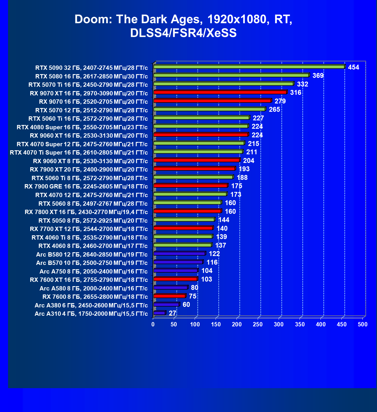 Все упомянутые видеокарты подойдут и для игр на мониторах с более массовым разрешением Full HD. При включении трассировки лучей совместно с DLSS, FSR или XeSS полный комфорт обеспечивают карты уровня Radeon RX 7700 XT, GeForce RTX 4060, Arc B580, а также GeForce RTX 5060 и GeForce RTX 5050 (только при использовании DLSS 4).