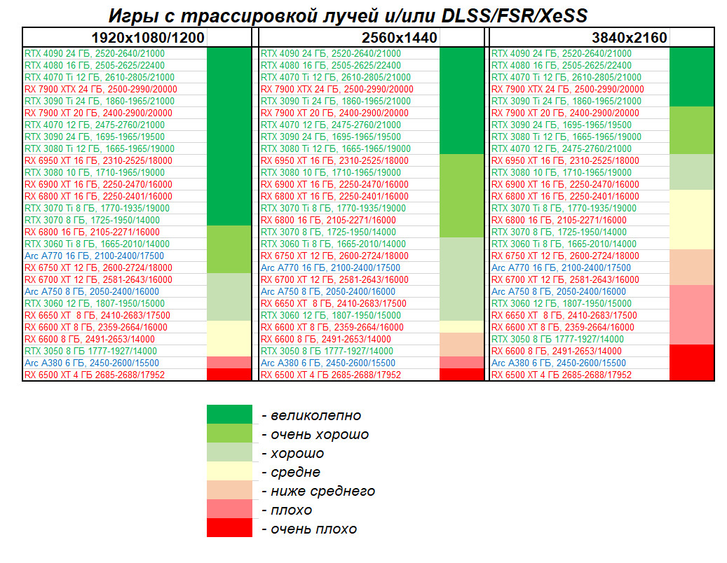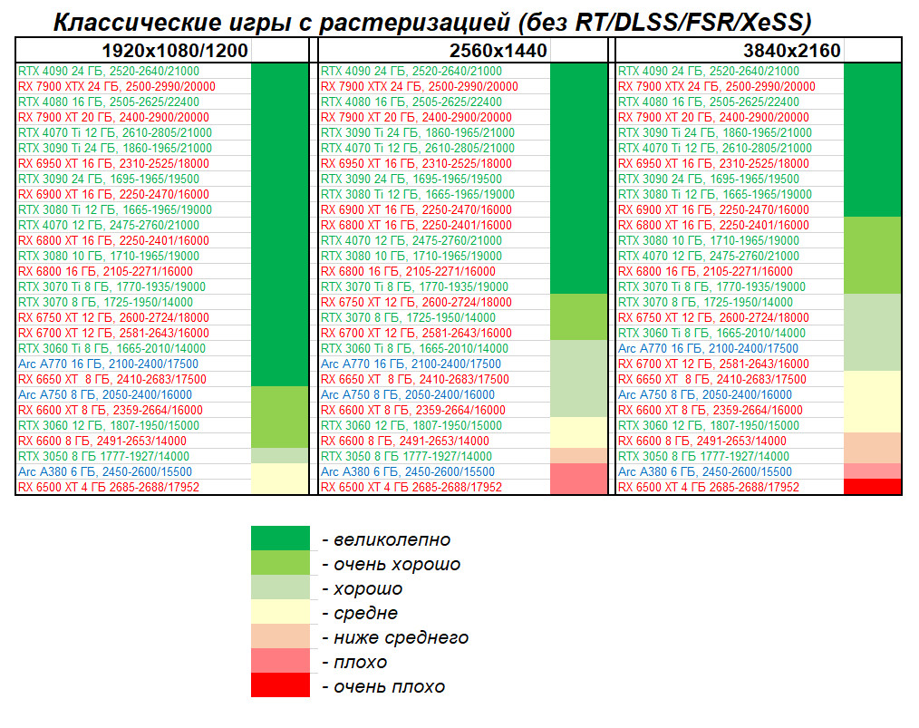 Этот материал демонстрирует не только общий рейтинг видеокарт по производительности, но и их полезность с учетом цены на начало апреля 2023 года (материал готовился до выхода на рынок GeForce RTX 4070).