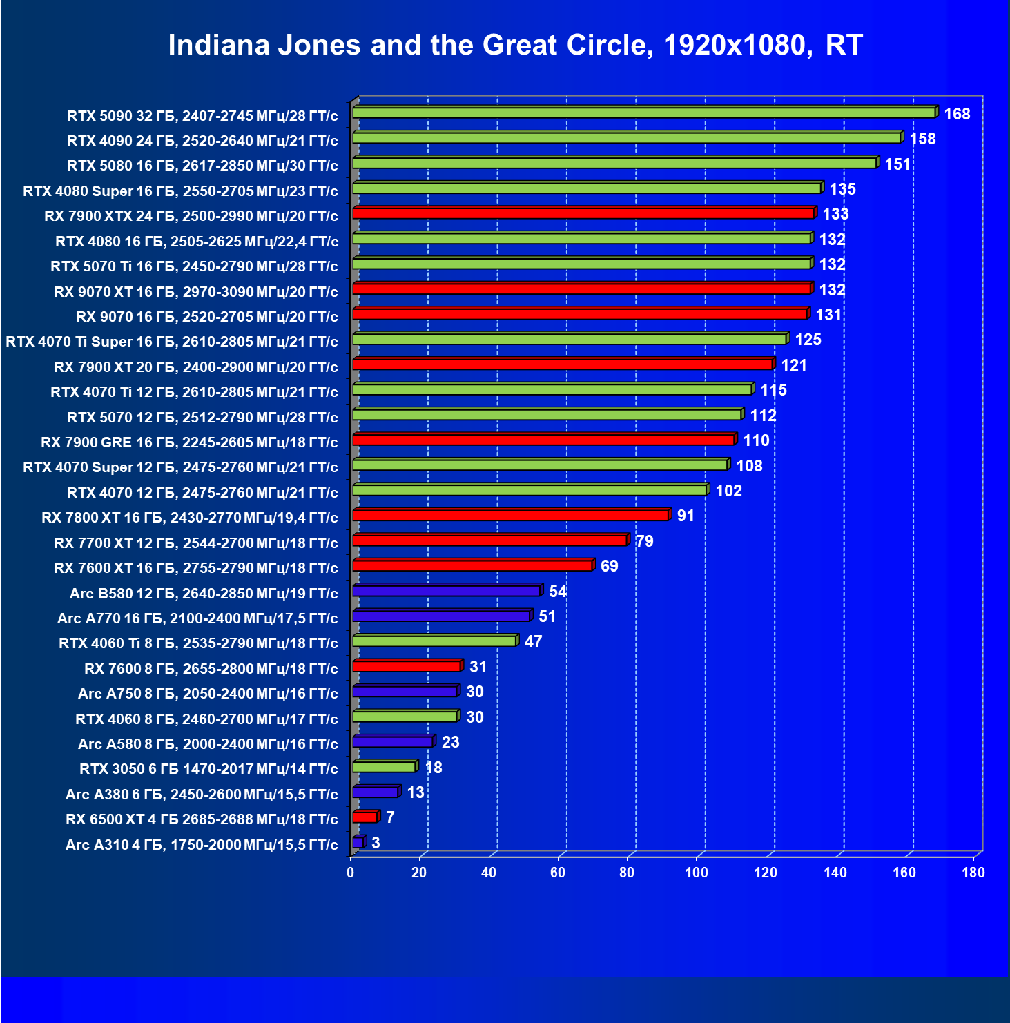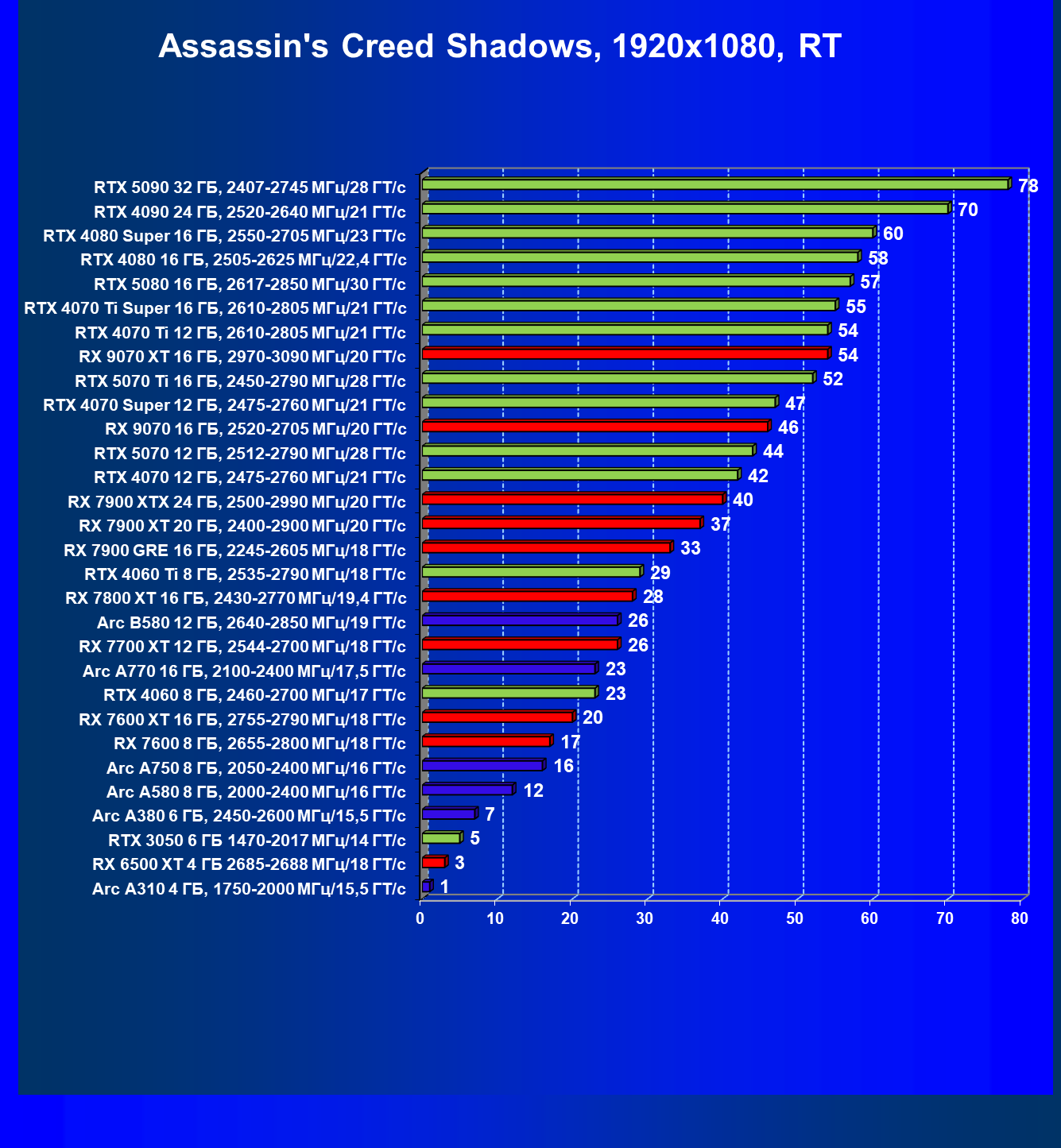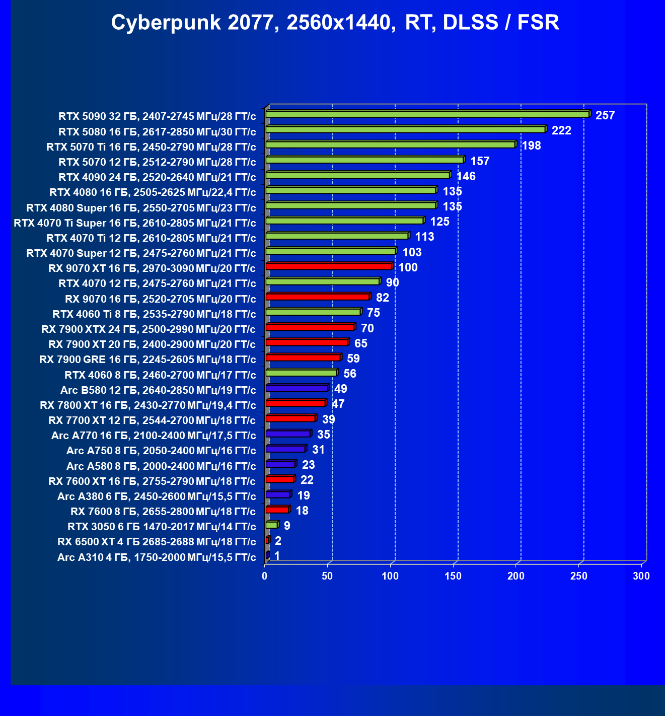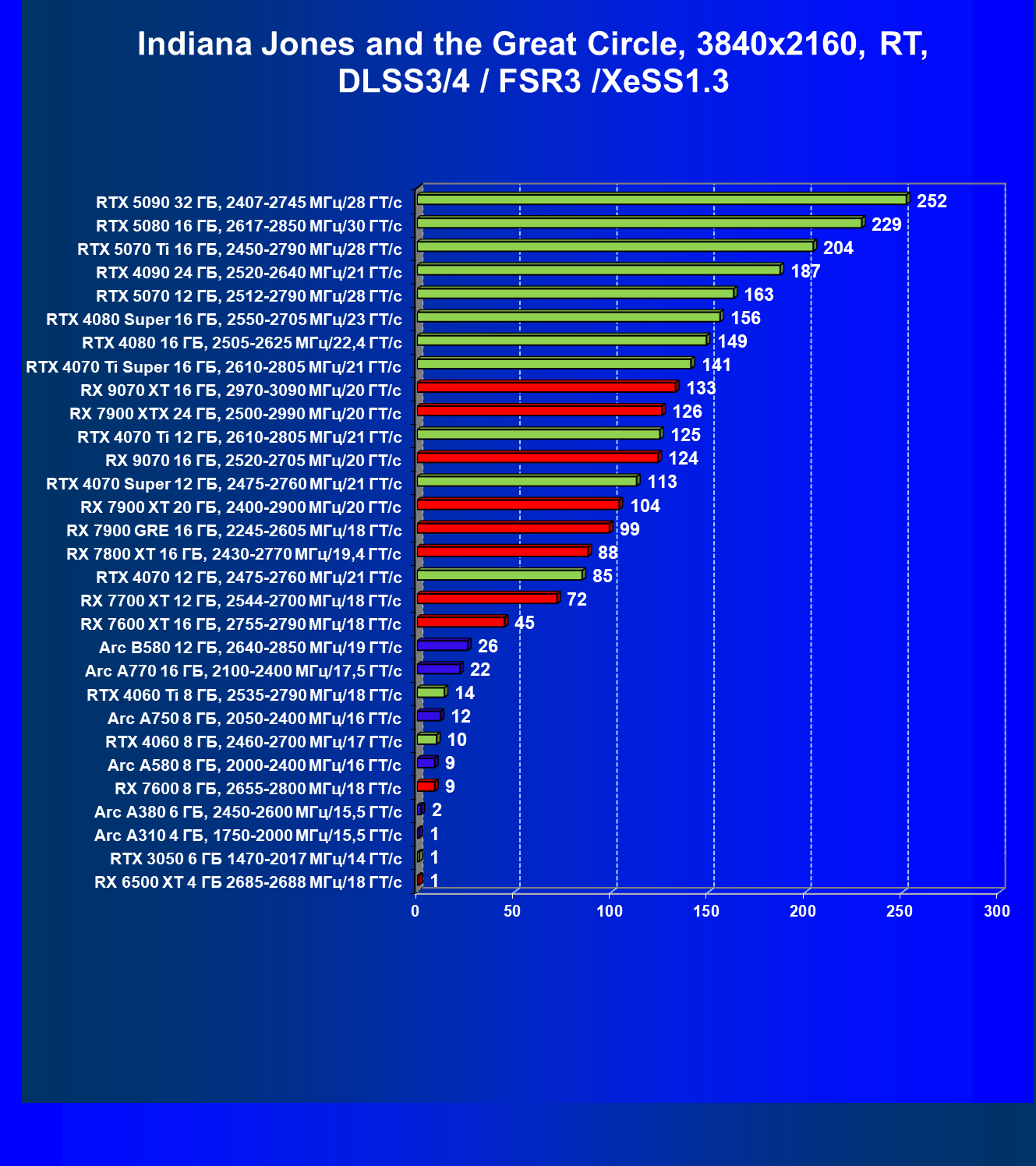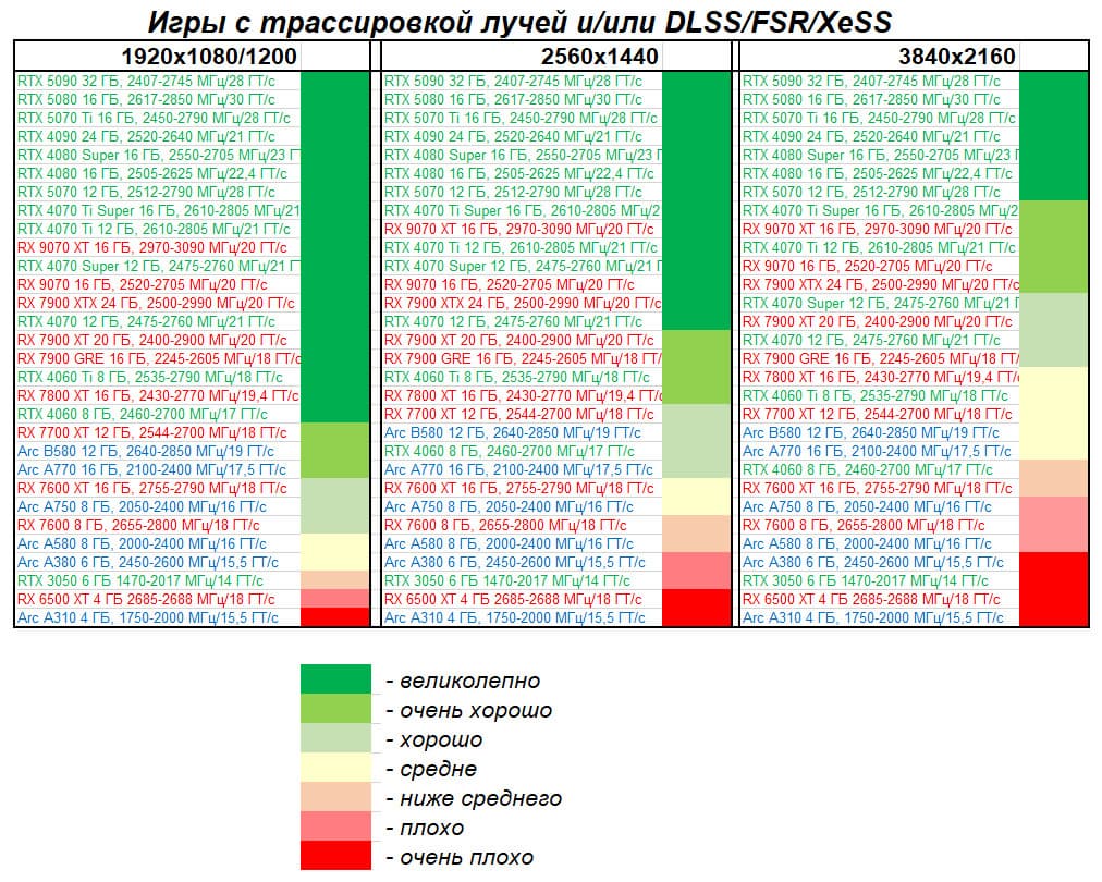 Все упомянутые видеокарты подойдут и для игр на мониторах с более массовым разрешением Full HD. При включении трассировки лучей совместно с DLSS, FSR или XeSS полный комфорт обеспечивают карты уровня Radeon RX 7700 XT, GeForce RTX 4060, Arc B580, а также Arc A770.