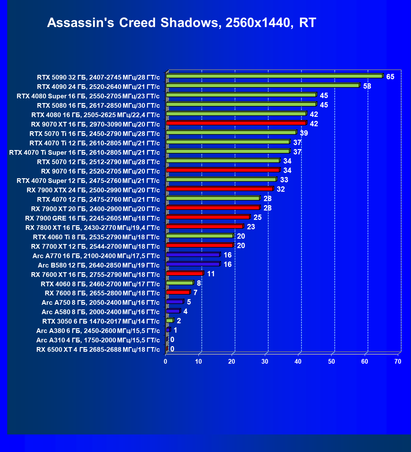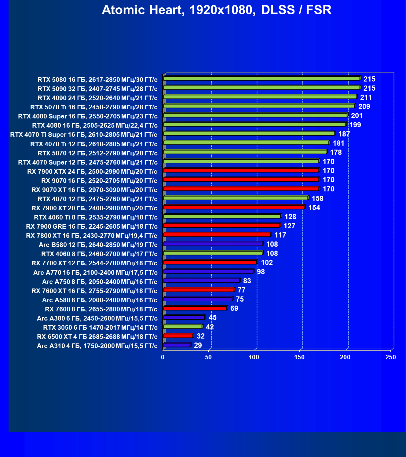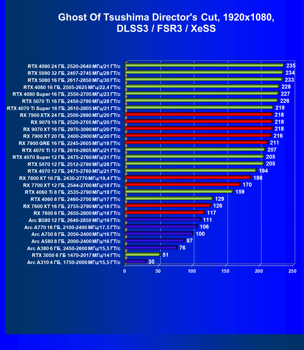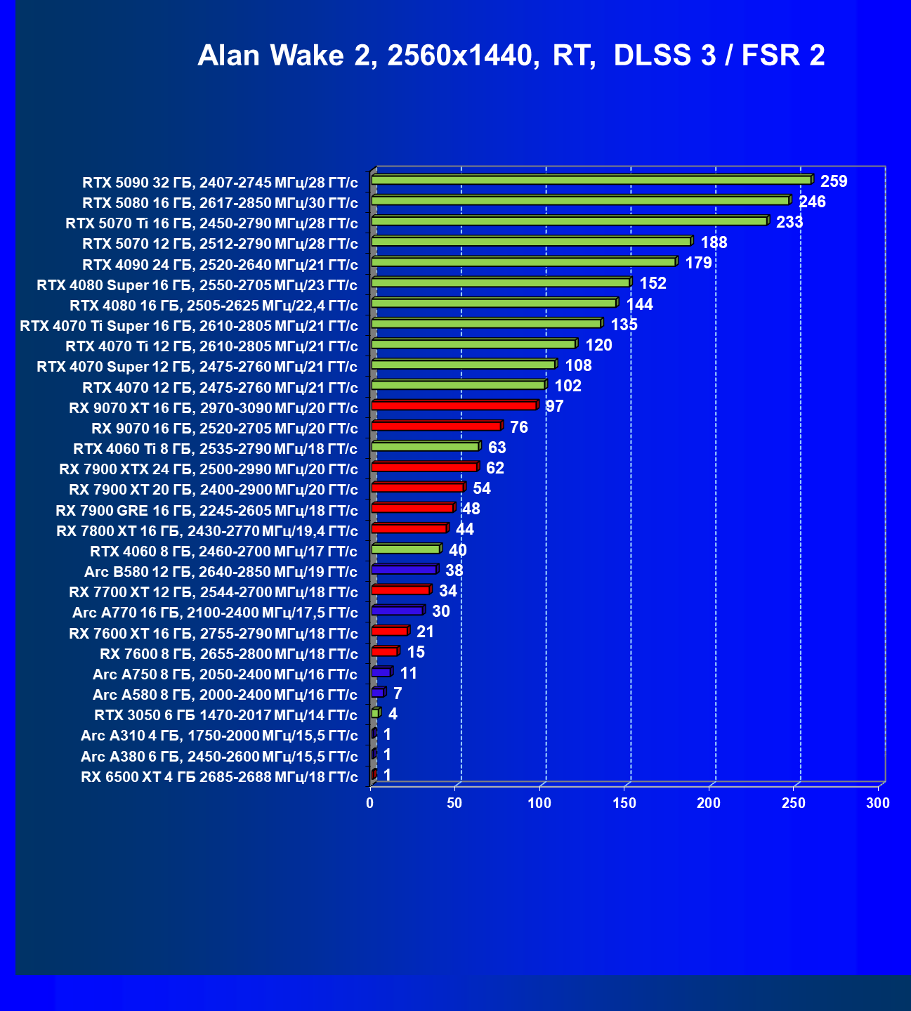 Все упомянутые видеокарты подойдут и для игр на мониторах с более массовым разрешением Full HD. При включении трассировки лучей совместно с DLSS, FSR или XeSS полный комфорт обеспечивают карты уровня Radeon RX 7700 XT, GeForce RTX 4060, Arc B580, а также Arc A770.