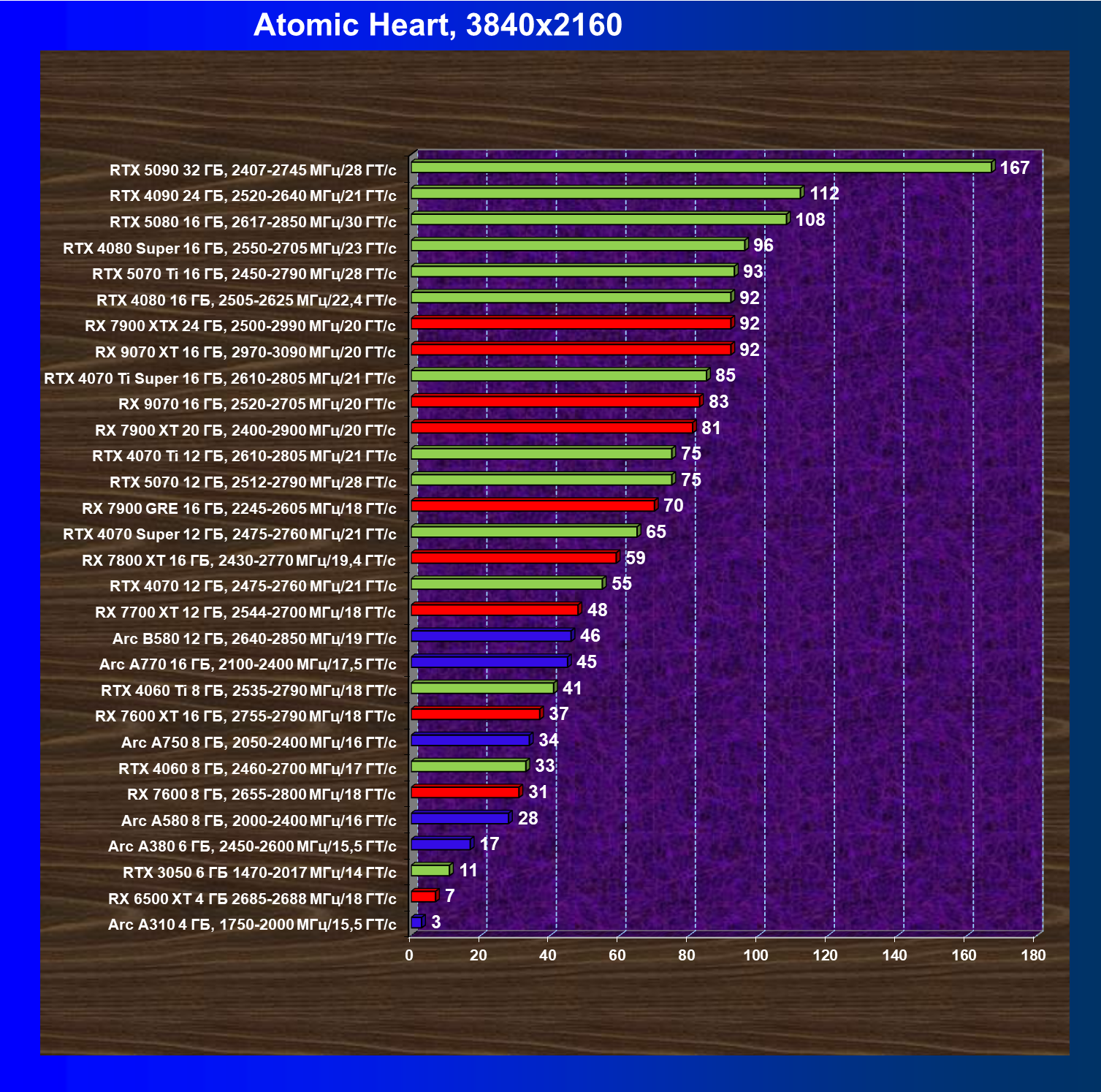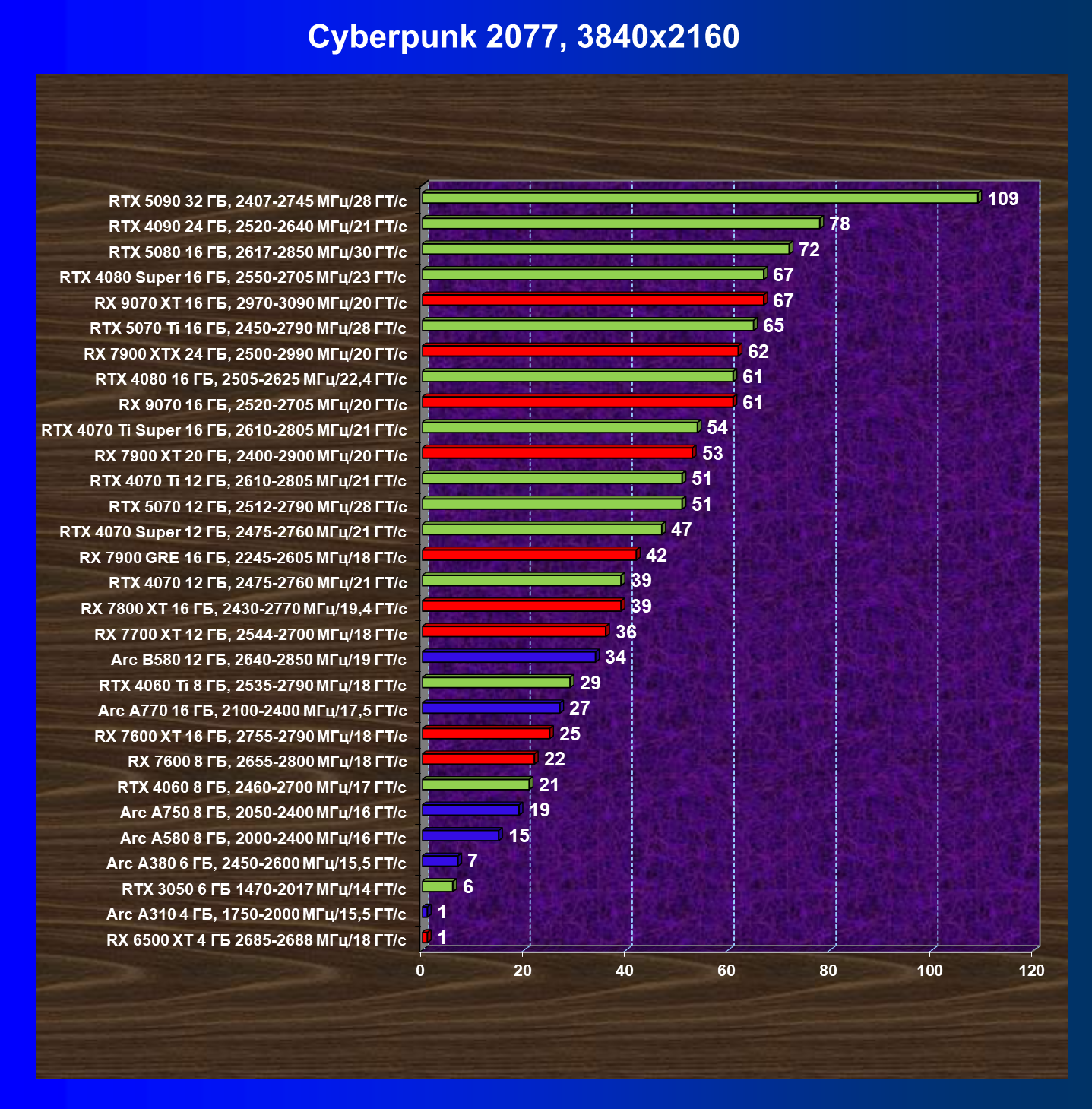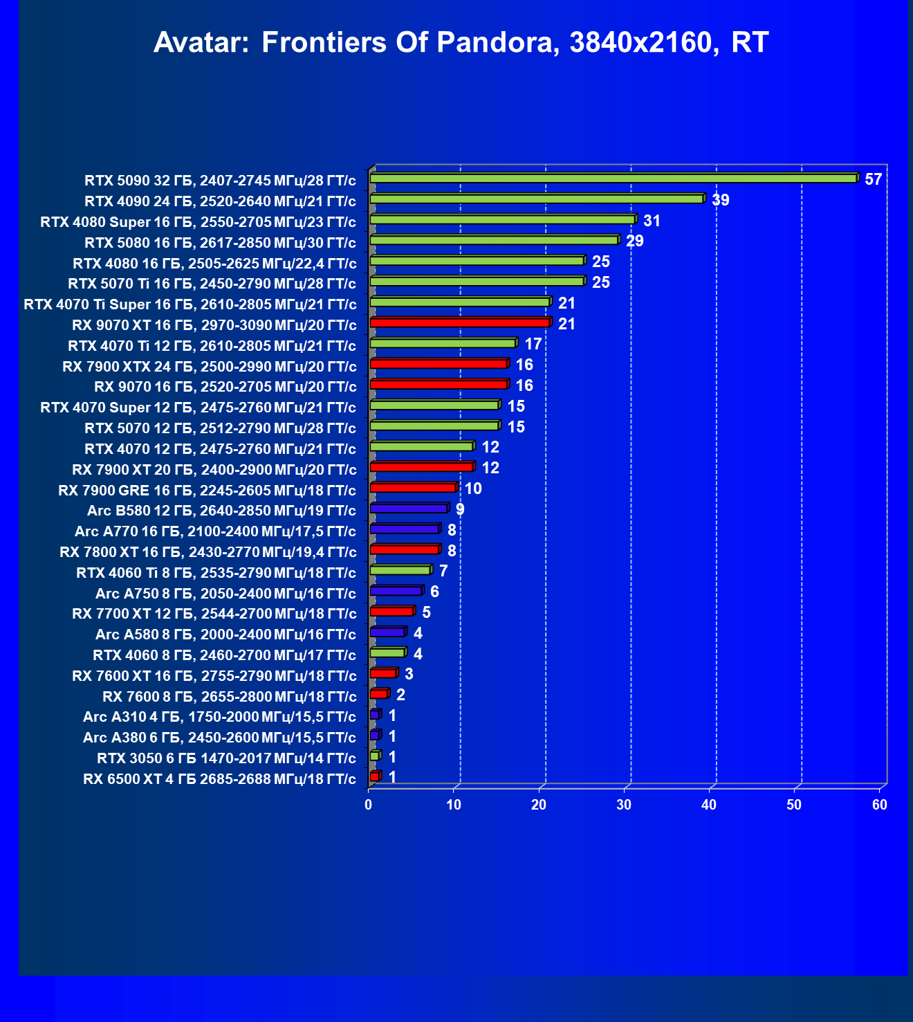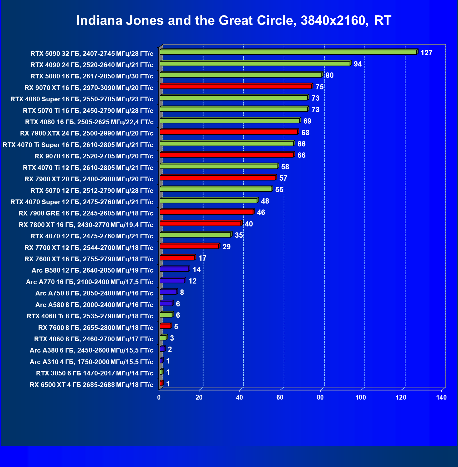 GeForce RTX 5090, GeForce RTX 5080, GeForce RTX 4090, GeForce RTX 4080 Super, GeForce RTX 4080, GeForce RTX 4070 Ti Super и Radeon RX 7900 XTX, в принципе, в каких-то играх осиливают даже разрешение 8K, но без оговорок — только GeForce RTX 5090, GeForce RTX 5080 и GeForce RTX 4090.