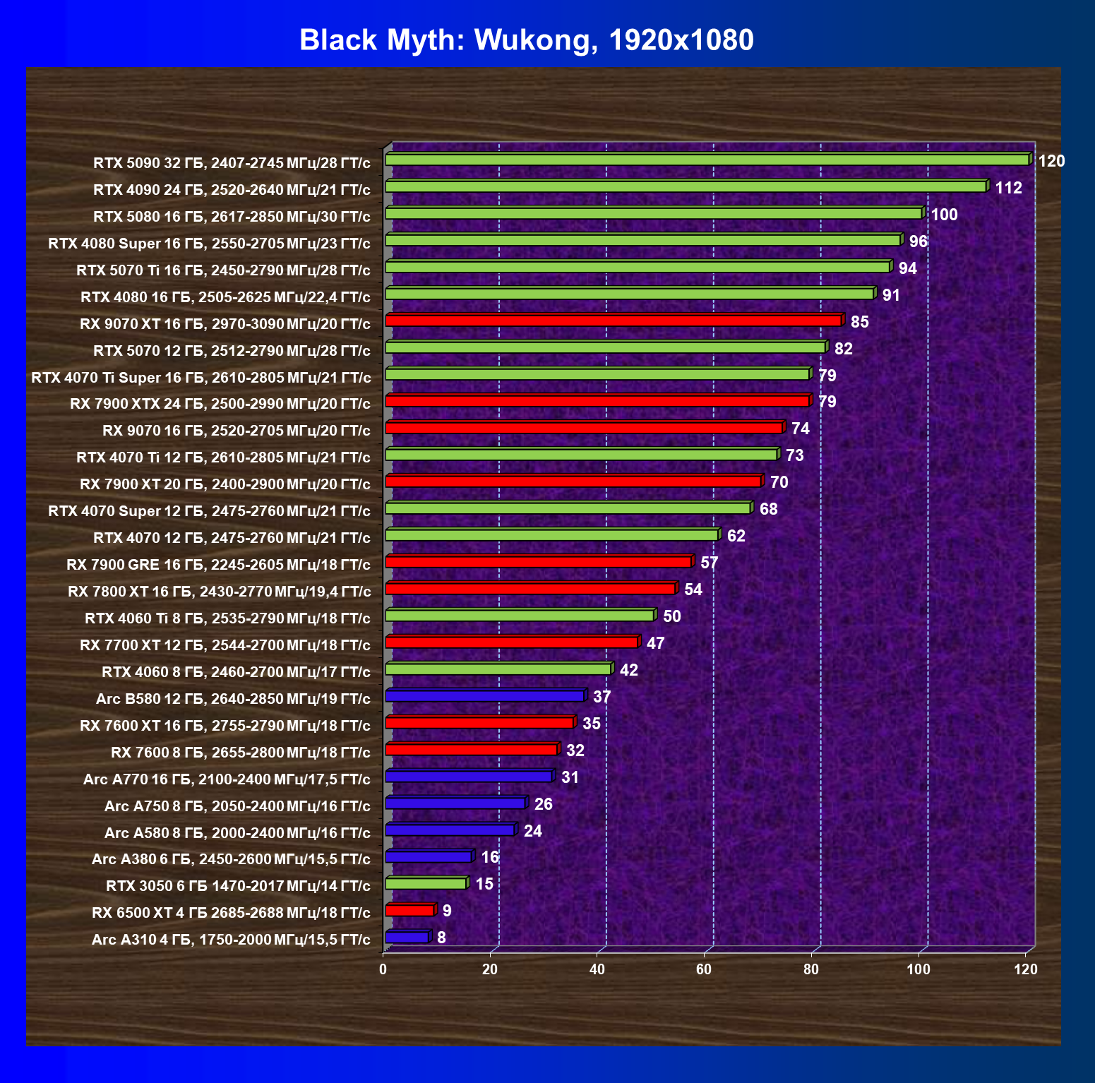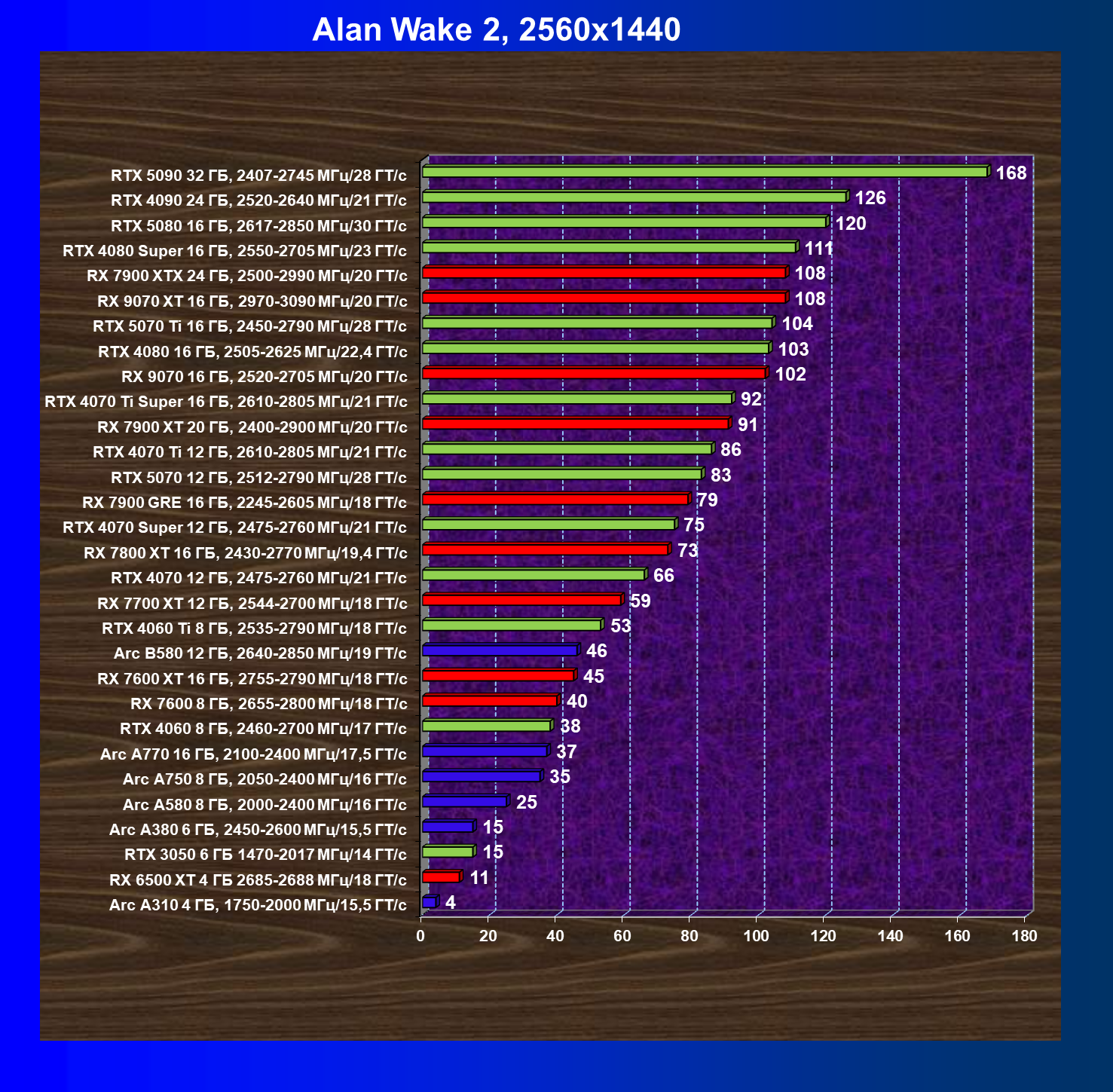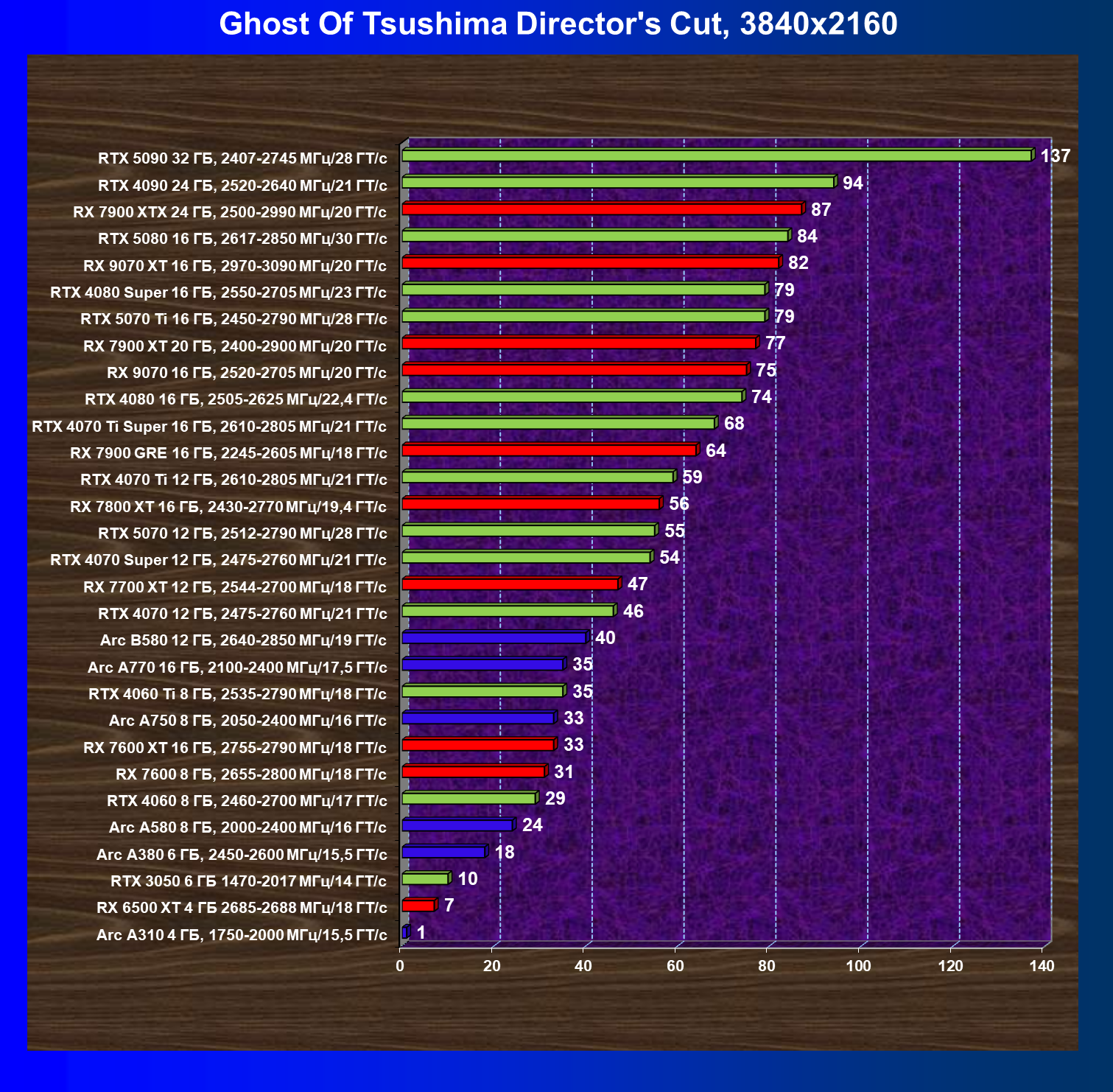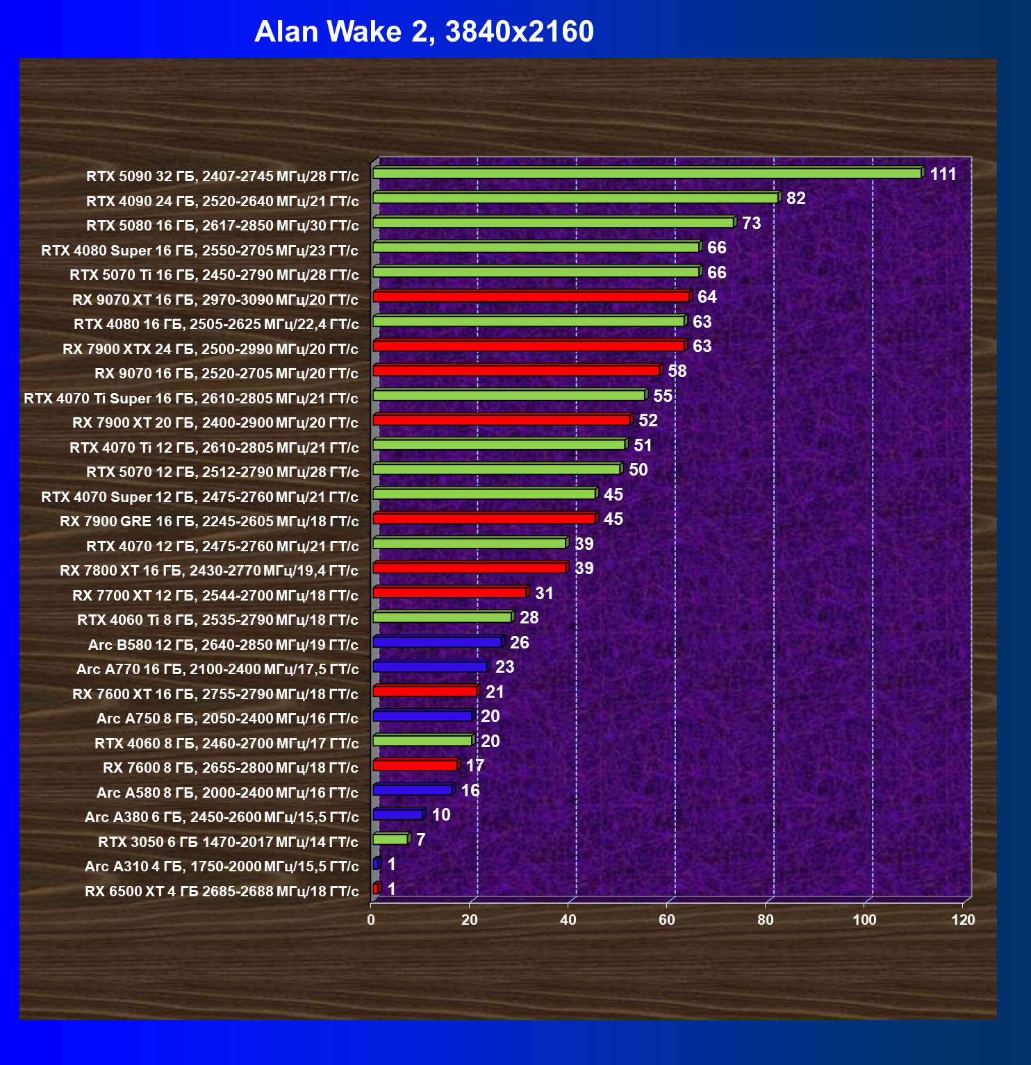 GeForce RTX 5090, GeForce RTX 5080, GeForce RTX 4090, GeForce RTX 4080 Super, GeForce RTX 4080, GeForce RTX 4070 Ti Super и Radeon RX 7900 XTX, в принципе, в каких-то играх осиливают даже разрешение 8K, но без оговорок — только GeForce RTX 5090, GeForce RTX 5080 и GeForce RTX 4090.
