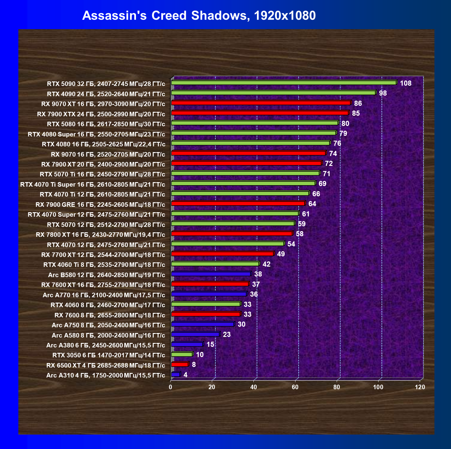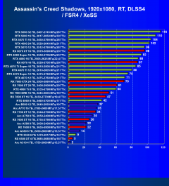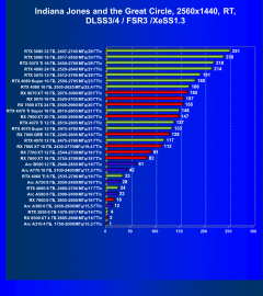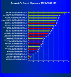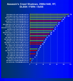 В наборе тестовых игр произошли изменения: добавились результаты из игр Indiana Jones and the Great Circle (тестирование без трассировки лучей невозможно, поэтому только с RT и DLSS/FSR/XeSS) и Assassin’s Creed Shadow («классические» тесты, а также тесты с трассировкой лучей и динамическим масштабированием).