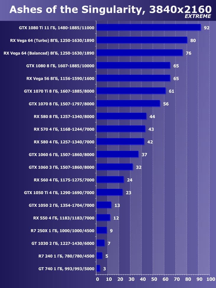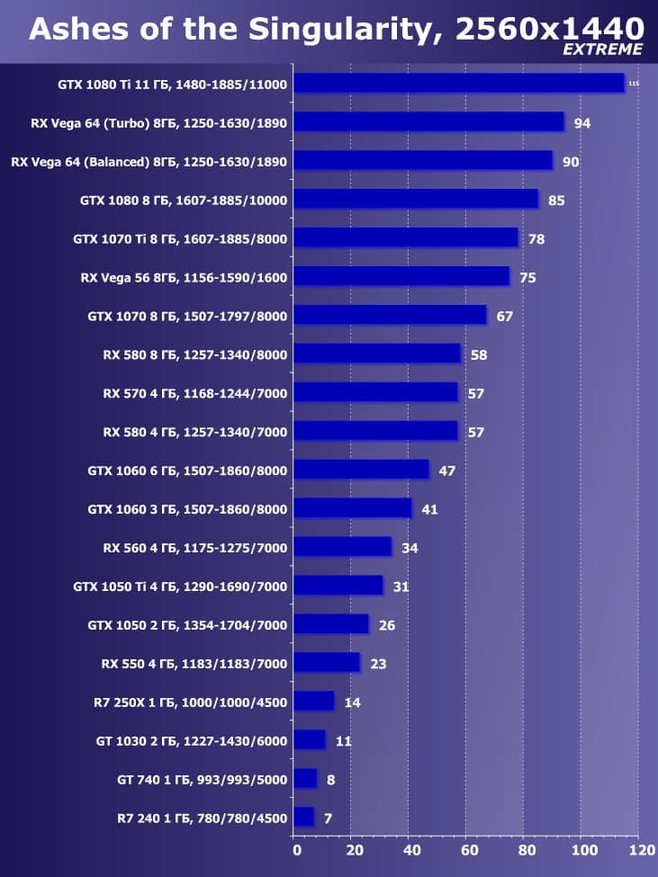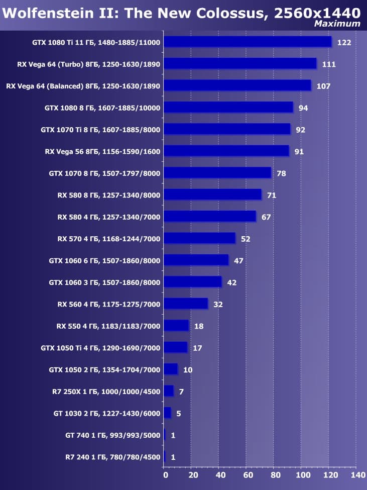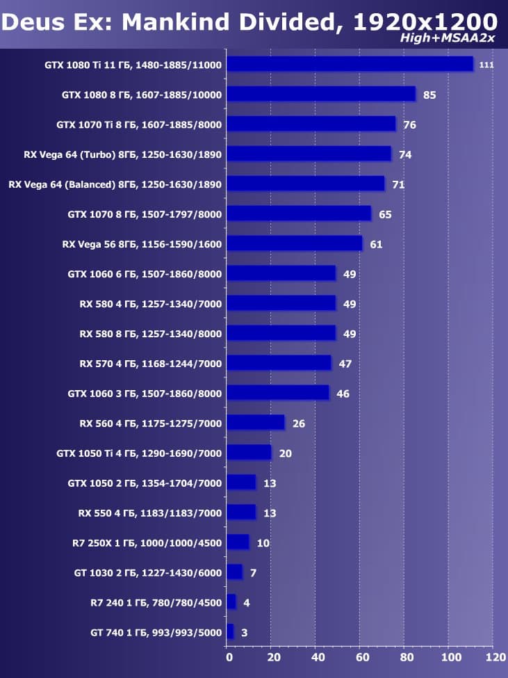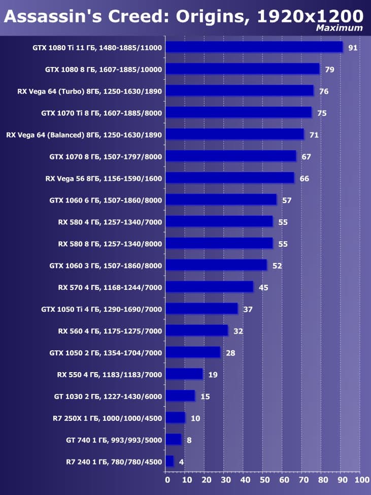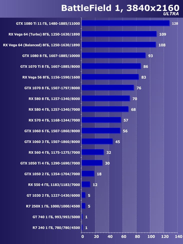 Итак, лучшим ускорителем по соотношению цены и возможностей на начало мая 2018 года для разрешения 4К (при максимальном качестве) является ускоритель класса GeForce GTX 1080 Ti. Для разрешения 2.5К (при максимальном качестве) подойдет GeForce GTX 1080, если же пользователь согласен понизить уровень качества, то для такого разрешения подойдет и Radeon RX 580 8 ГБ, который также отлично годится для Full HD (или 1920×1200) на максимальных настройках. Остальные карты уже не тянут разрешение Full HD при максимальном качестве, а значит, придется понижать качество картинки.