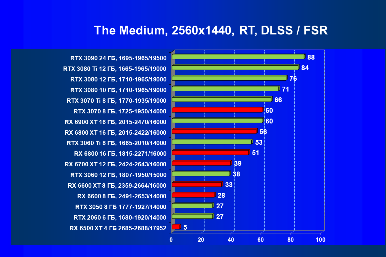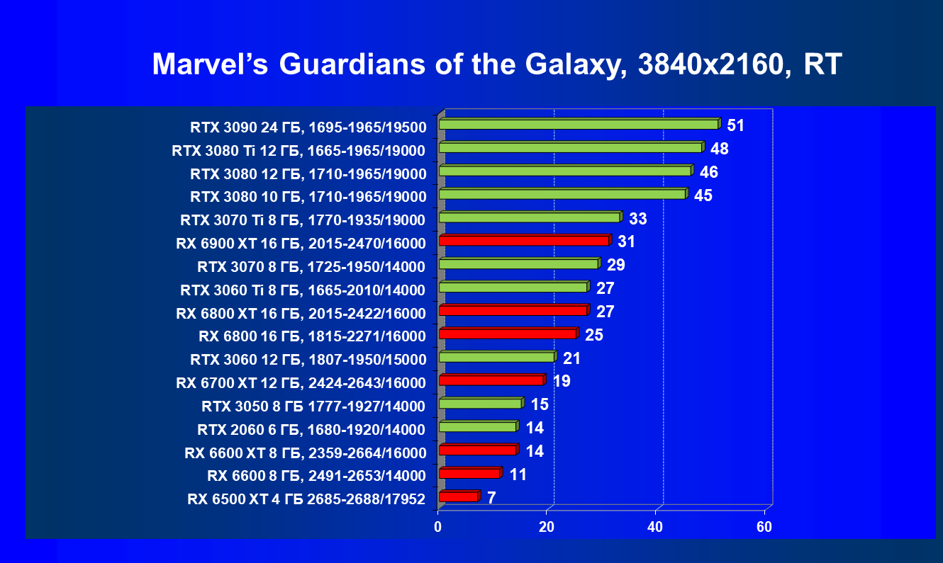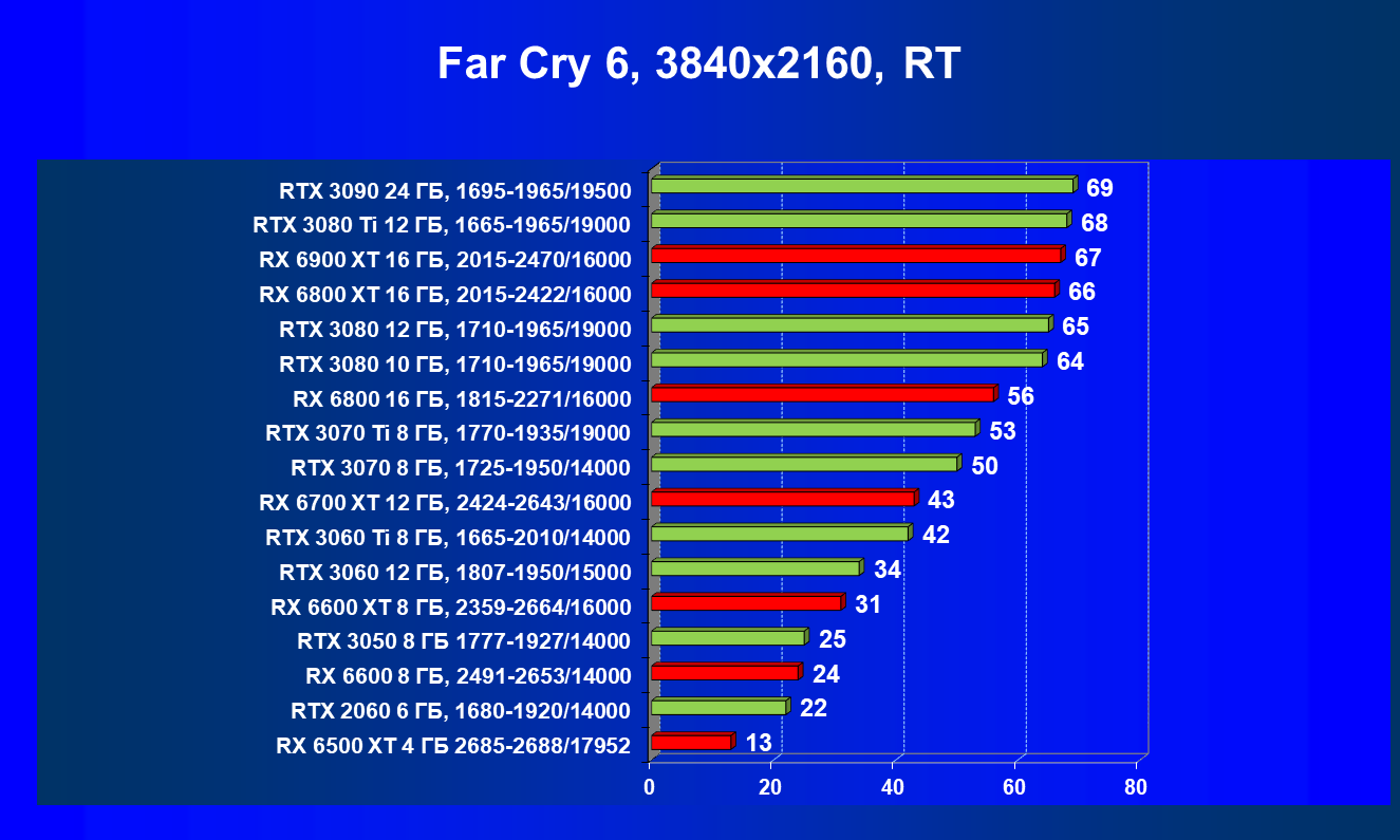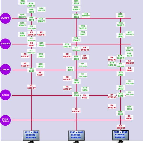 Лучшие ускорители для разрешения 4К (при максимальном качестве графики) — GeForce RTX 3090, GeForce RTX 3080 Ti, GeForce RTX 3080, Radeon RX 6900 XT, Radeon RX 6800 XT. Они обеспечивают высокий уровень комфорта во всех играх без использования трассировки лучей. При включении RT ускорители Radeon RX 6000 для 4К смотрятся гораздо бледнее, скорее в их случае можно рассчитывать лишь на 2.5К. В принципе, для 4К еще вполне подойдут GeForce RTX 3070 Ti, GeForce RTX 3070 и Radeon RX 6800, но не во всех играх можно будет получить полный комфорт при максимальных настройках графики даже без RT.