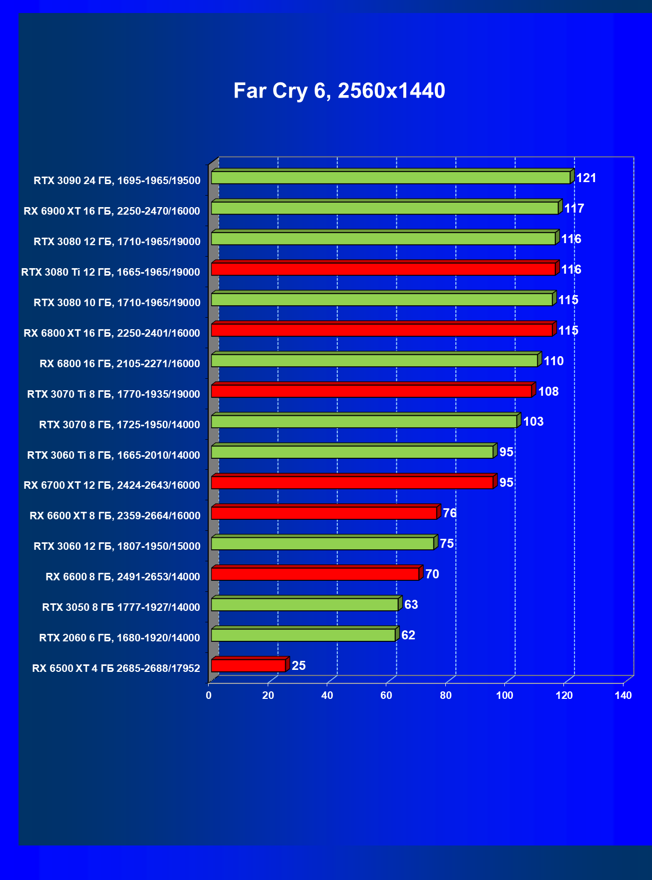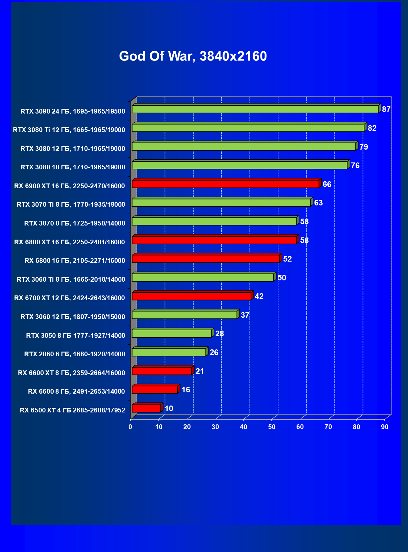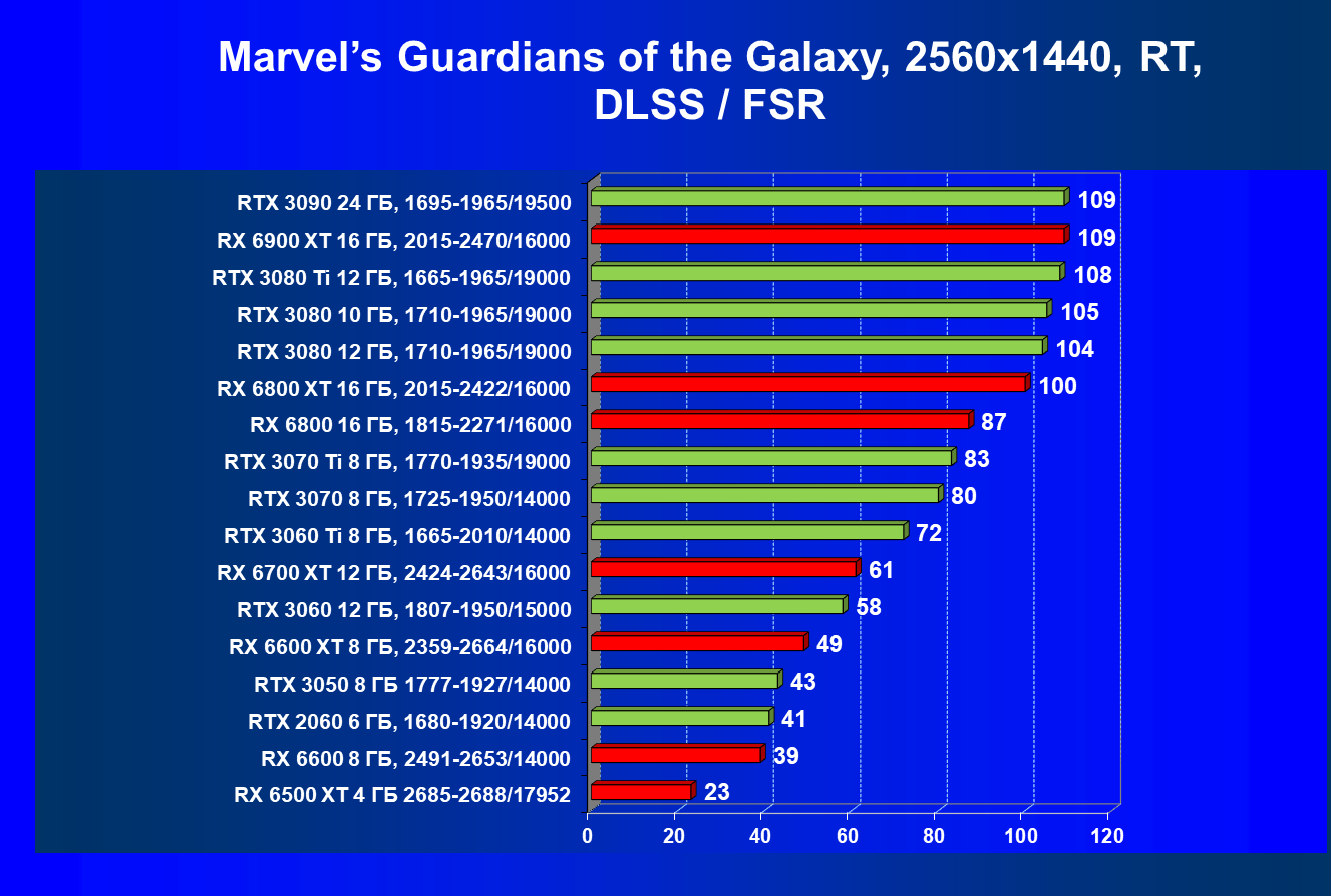 Лучшие ускорители для разрешения 4К (при максимальном качестве графики) — GeForce RTX 3090, GeForce RTX 3080 Ti, GeForce RTX 3080, Radeon RX 6900 XT, Radeon RX 6800 XT. Они обеспечивают высокий уровень комфорта во всех играх без использования трассировки лучей. При включении RT ускорители Radeon RX 6000 для 4К смотрятся гораздо бледнее, скорее в их случае можно рассчитывать лишь на 2.5К. В принципе, для 4К еще вполне подойдут GeForce RTX 3070 Ti, GeForce RTX 3070 и Radeon RX 6800, но не во всех играх можно будет получить полный комфорт при максимальных настройках графики даже без RT.