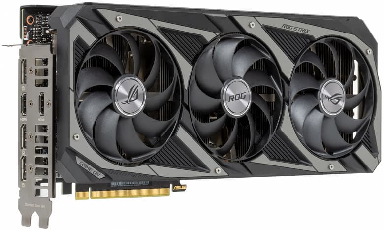 Видеокарта отлично подходит для игры с максимальным качеством графики в разрешении Full HD даже с RT, но обязательно нужна поддержка DLSS, поскольку ее использование в значительной степени компенсирует падение производительности от включения RT. Габариты у карты Asus вполне стандартные (300×134×55 мм), имеется 3 видеовыхода DisplayPort 1.4a и два HDMI 2.1. Питание подается через один 8-контактный разъем.