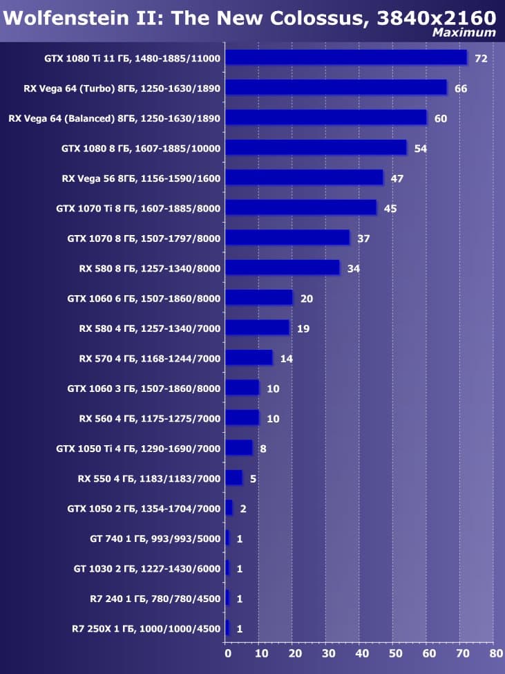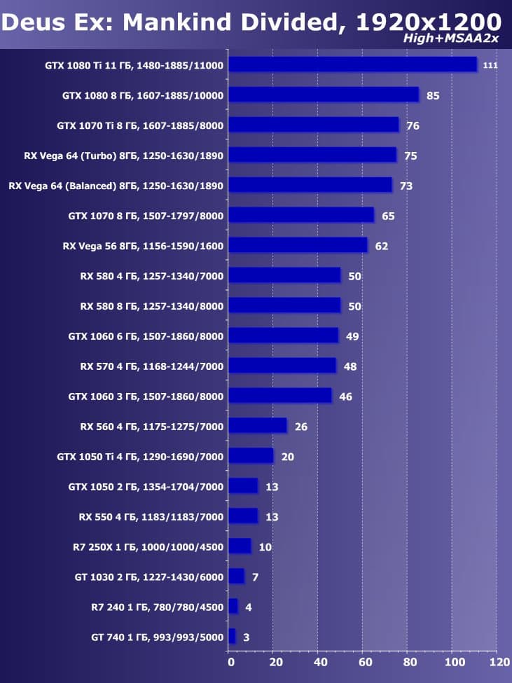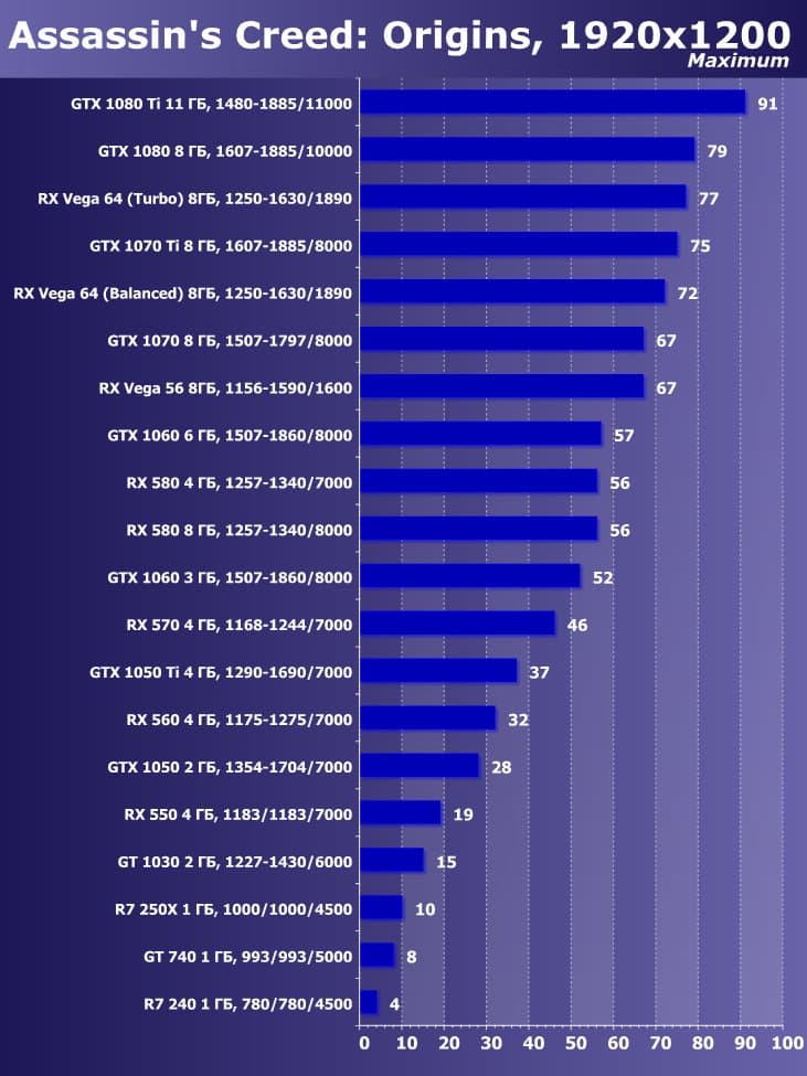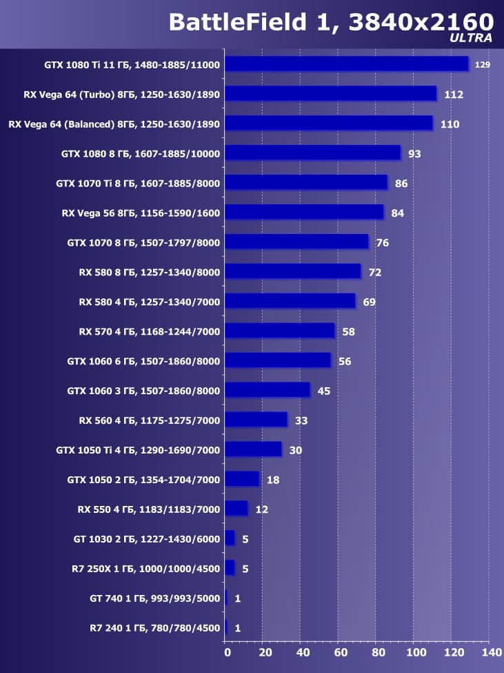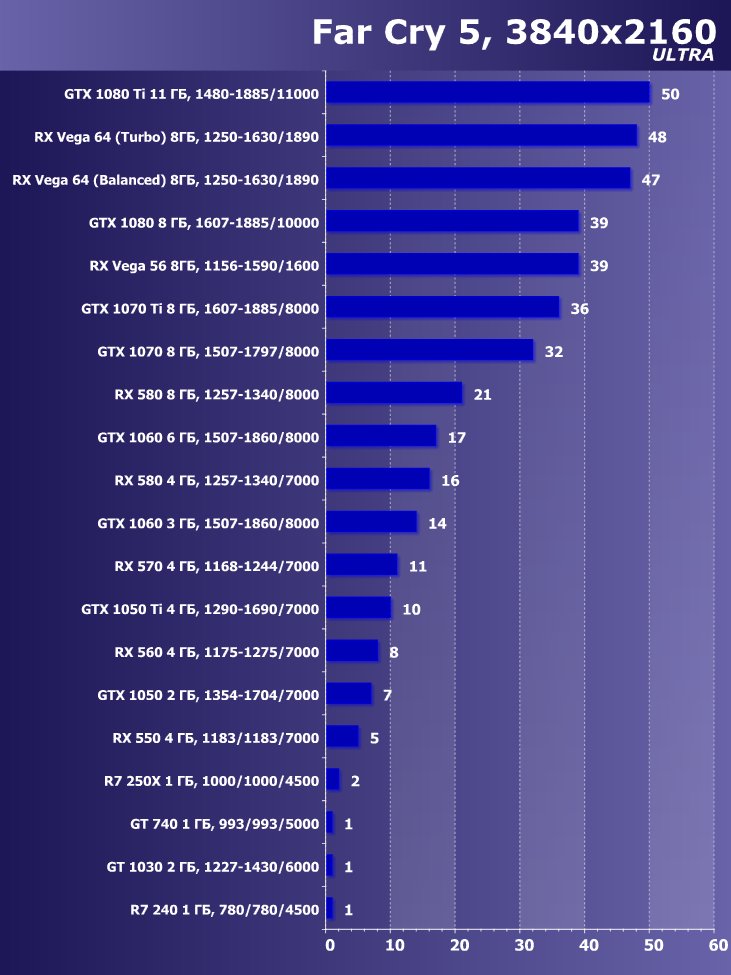 Итак, лучшим ускорителем по соотношению цены и возможностей на начало июня 2018 года для разрешения 4К (при максимальном качестве) является ускоритель GeForce GTX 1080 Ti. Для разрешения 2.5К (при максимальном качестве) подойдет GeForce GTX 1080, если же пользователь согласен понизить уровень качества, то для такого разрешения подойдет и Radeon RX 580 8 ГБ, который также отлично годится для Full HD (или 1920×1200) на максимальных настройках. Менее производительные карты уже не тянут разрешение Full HD при максимальном качестве, а значит, придется понижать качество картинки.