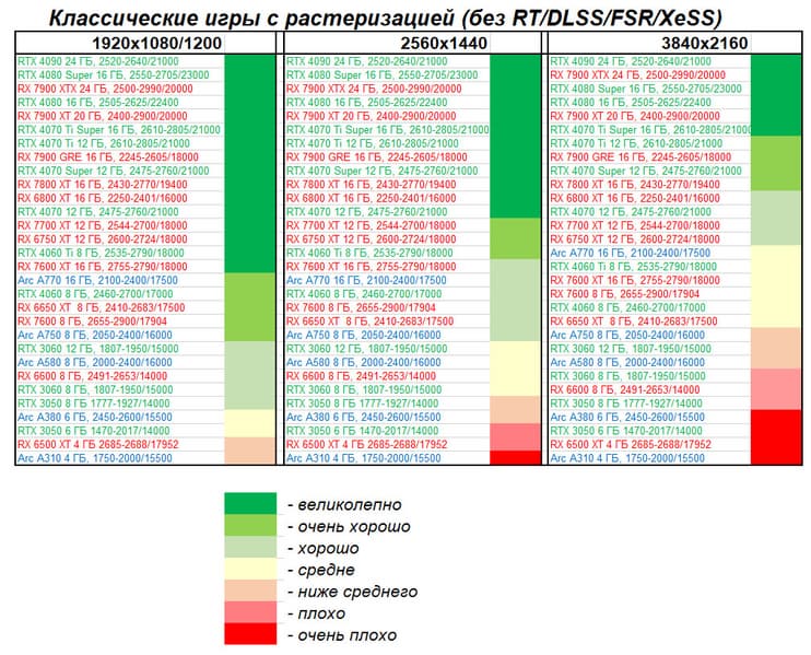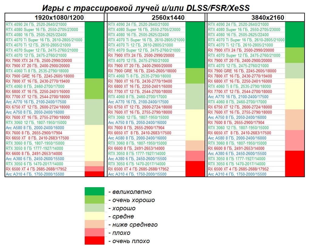 Все упомянутые видеокарты подойдут и для игр на мониторах с более массовым разрешением Full HD. При включении трассировки лучей совместно с DLSS, FSR или XeSS полный комфорт обеспечивают карты уровня Radeon RX 7700 XT, Radeon RX 6750 XT, GeForce RTX 4060, GeForce RTX 3060 12 ГБ, а также Arc A770.
